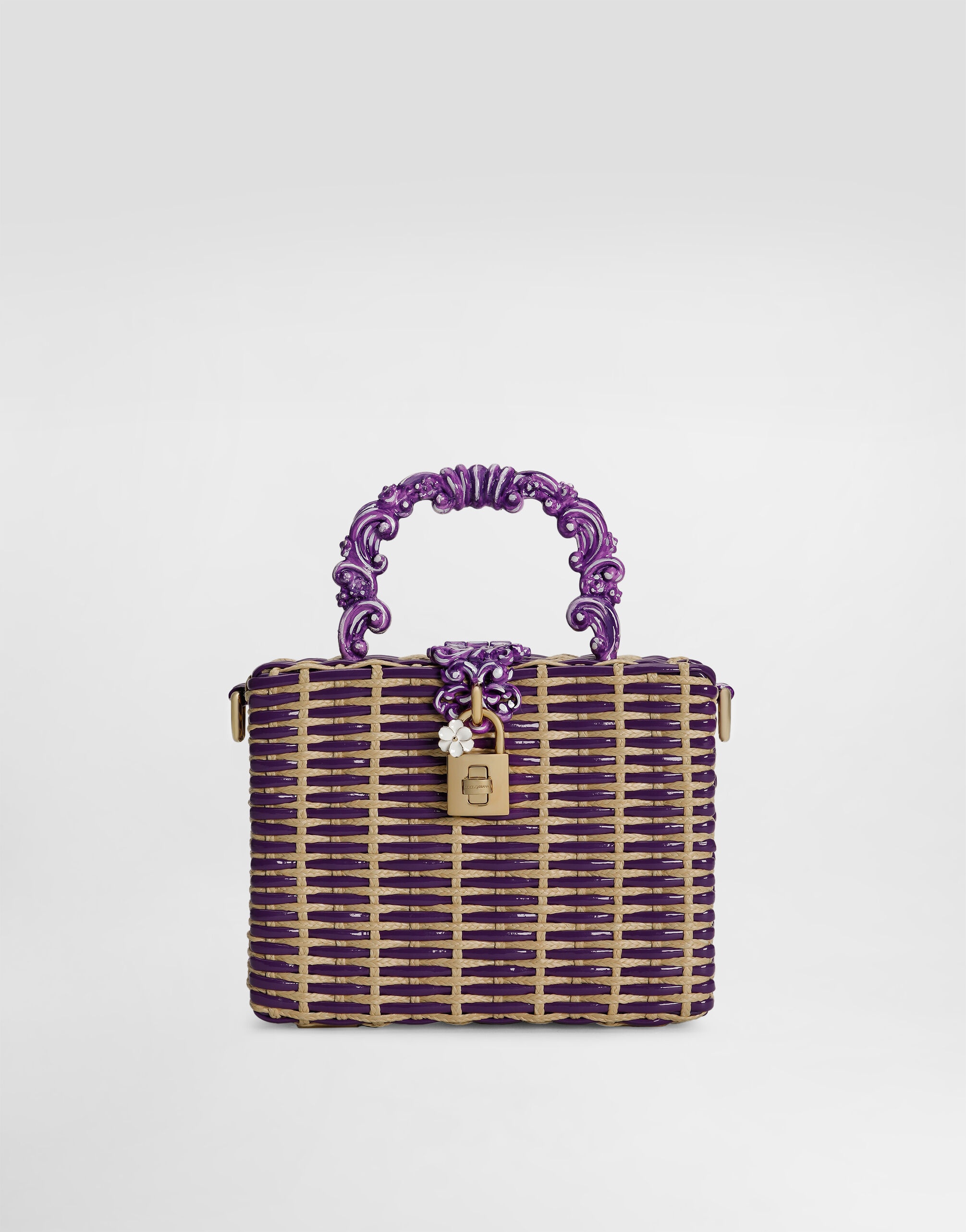 A masterpiece of craftsmanship, the Dolce Box bag combines the interweaving of shiny Calfskin and raffia with hand-painted baroque details, expressing timeless elegance. Woven Dolce Box handbag: • Multi-coloured • Hand-painted baroque handle and removable and adjustable shoulder strap • Padlock and swivel closure in electroplated light gold with enameled flower • Interior with card pocket and flat pocket • Item equipped with a logo bag and pre-assembled box • Measurements: A14.5x L19 x P7 cm • Can hold keys, card holder and phone. • Made in Italy External Composition: 50% Viscose, 50% CalfskinInternal Composition: 100% Cotton