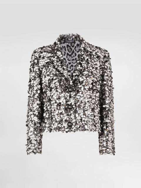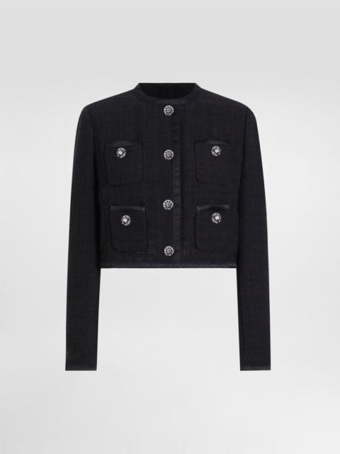 Cropped single-breasted raschel tweed jacket with bejeweled buttons