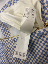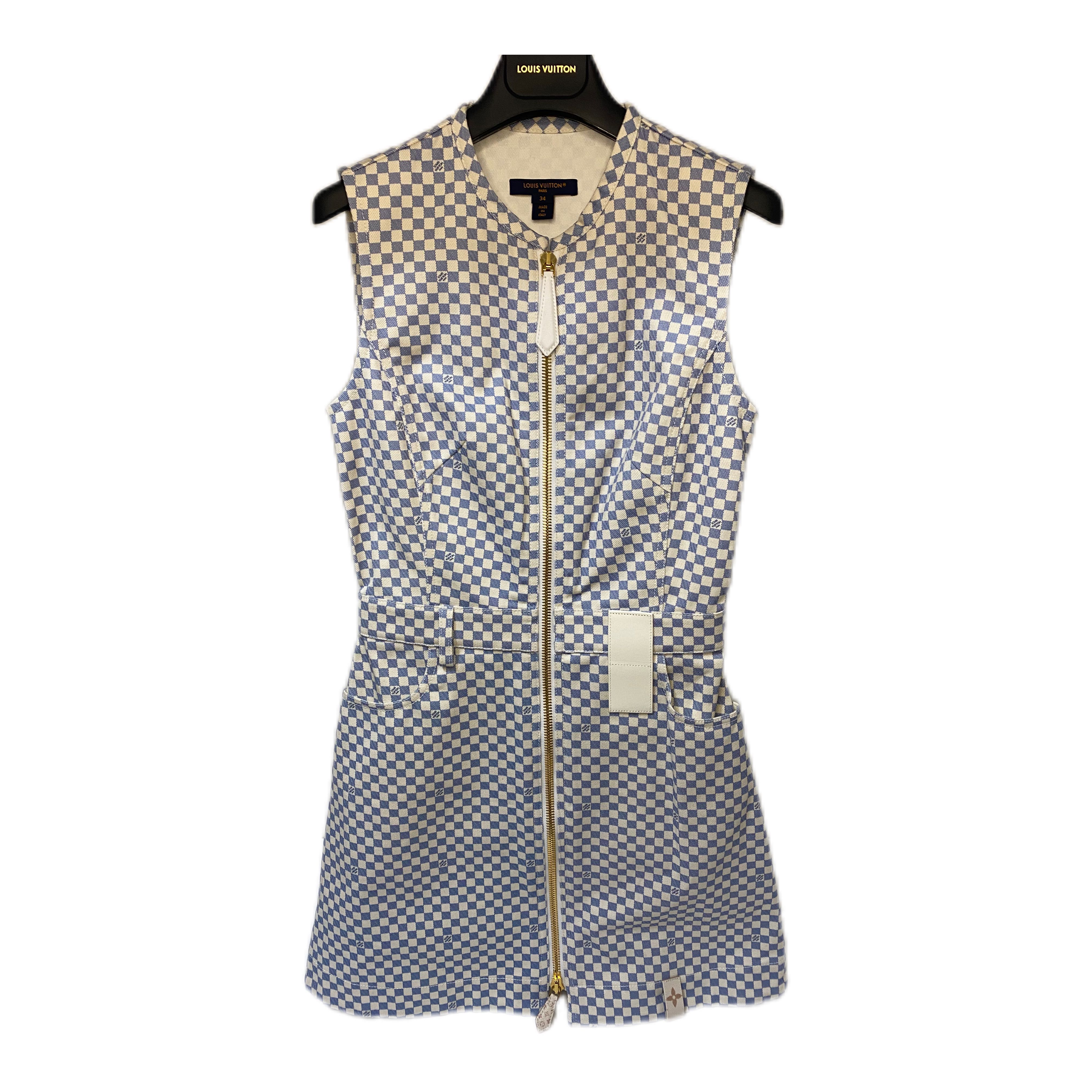 Louis Vuitton Damier Mini dress size 34 , Crafted from cotton gabardine, this mini dress from Louis Vuitton is adorned with the Maison’s iconic Damier motif in pastel hues. That, however, isn’t the only signature detail featured in this piece. Note the bottom zip and leather tab on the hemline, which showcase the instantly recognisable Monogram. Dry clean Two-way zip fastening Made in Italy Round neck Check print Sleeveless Brand new !
