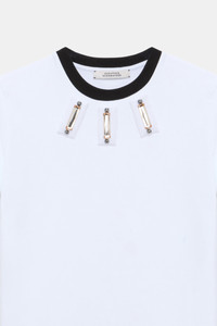 The stretch cotton T-shirt has contrast trim on the neckline and features hand-embellished baguette crystals on the front. Material & Care - 96 % Cotton, 4 % Elastane - Round neck with embroidered applique - 1x1 rib neckline in black - Handmade 3D applique with crystal stones at the neckline - Double layer sleeves - No dry cleaning - Wash with similar colors Size & Fit - Our Model is 178cm tall and wears a size 2. - Fitted