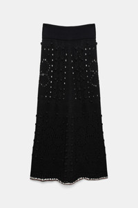 Let's talk details: The maxi skirt is knit in a cotton blend and has stitch and D-rose pointelle patterning. The ankle-grazing style has contrast crochet trim on the hemline. Material & Care - 65 % Cotton, 27 % Lyocell, 7 % Polyamide, 1 % Elastane - Cotton blend maxi skirt - Mixed texture stitching and D-rose pointelle patterning in pure cotton - Contrast color crochet trim - Slip lining Size & Fit - Fitted at the hips - Slight A-line flare