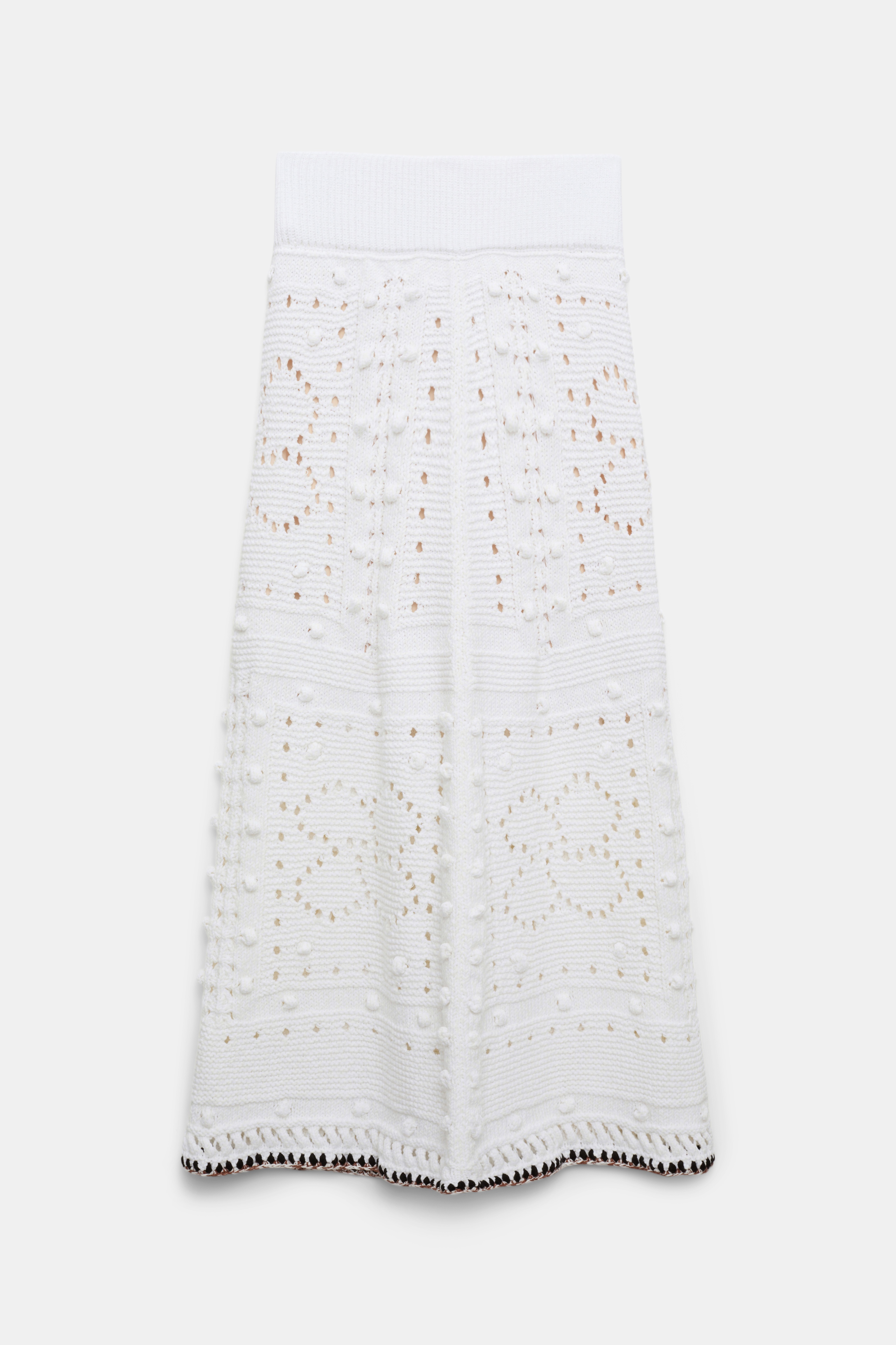 Let's talk details: The maxi skirt is knit in a cotton blend and has stitch and D-rose pointelle patterning. The ankle-grazing style has contrast crochet trim on the hemline. Material & Care - 65 % Cotton, 27 % Lyocell, 7 % Polyamide, 1 % Elastane - Cotton blend maxi skirt - Mixed texture stitching and D-rose pointelle patterning in pure cotton - Contrast color crochet trim - Slip lining Size & Fit - Our model is 178 cm tall and wears a size S - Fitted at the hips - Slight A-line flare