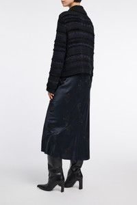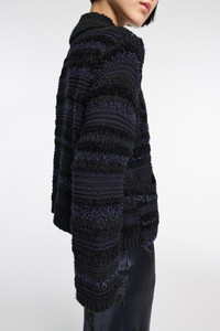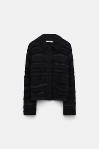 The cropped cardigan-jacket is knit with a tonal mix of textured and shimmering stripes. The boxy style has a spread collar and snap closures. Material & Care - 65 % Wool, 18 % Polyamide, 10 % Polyacrylic, 6 % Cotton, 1 % Elastane - Shimmering stripe knit cardigan-jacket - Tonal mixed texture knit stripes - Round neckline with spread collar - Patch pockets - Snap closures Size & Fit - Our model is 179 cm tall and wears a size S - Cropped, boxy fit - Slight dropped shoulders - Straight, wide sleeves