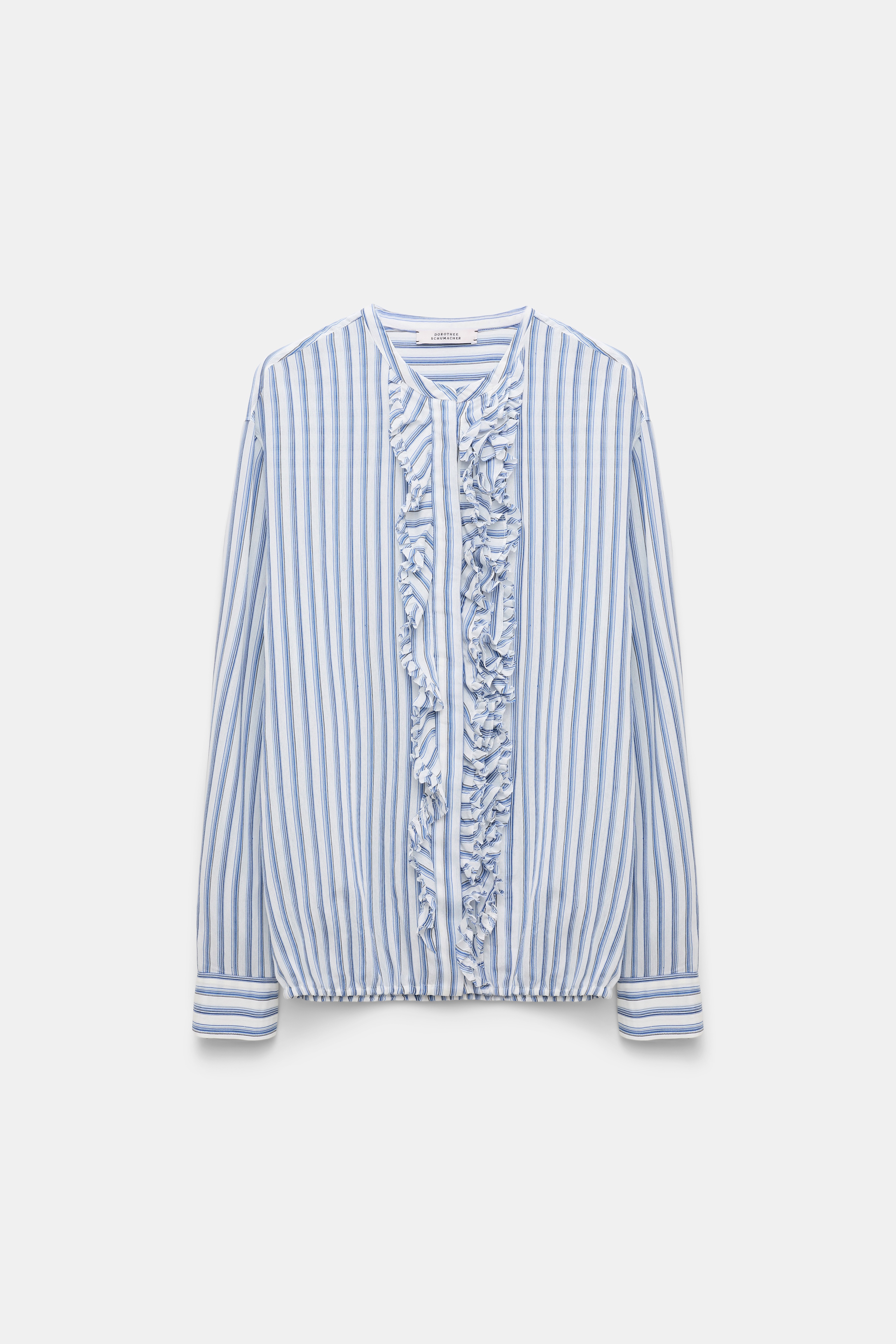 The blouse is made from silk-viscose and has asymmetric ruffle trim on the front. The blouse has a blouson-style elastic hemline. Material & Care - 84 % Viscose, 16 % Silk - Striped silk-viscose blouson-style blouse - Collarless - Hidden button placket with asymmetric ruffles - Elastic hemline - WE CARE - Fabric supplier produces according to 4sustainability Size & Fit - Our model is 178 cm tall and wears a size S - Relaxed fit - Dropped shoulders