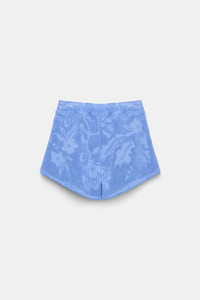 This is how we do beach: The cotton terry shorts have a drawstring waist and are covered with a floral jacquard print. The shorts have side pockets. Material & Care - 100 % Cotton - Cotton terry floral jacquard shorts - Drawstring waist - Side pockets - Fringed hem - Mild wash / Delicates - Wash with similar colors Size & Fit - Our model is 180cm tall and wears a size S - Relaxed fit