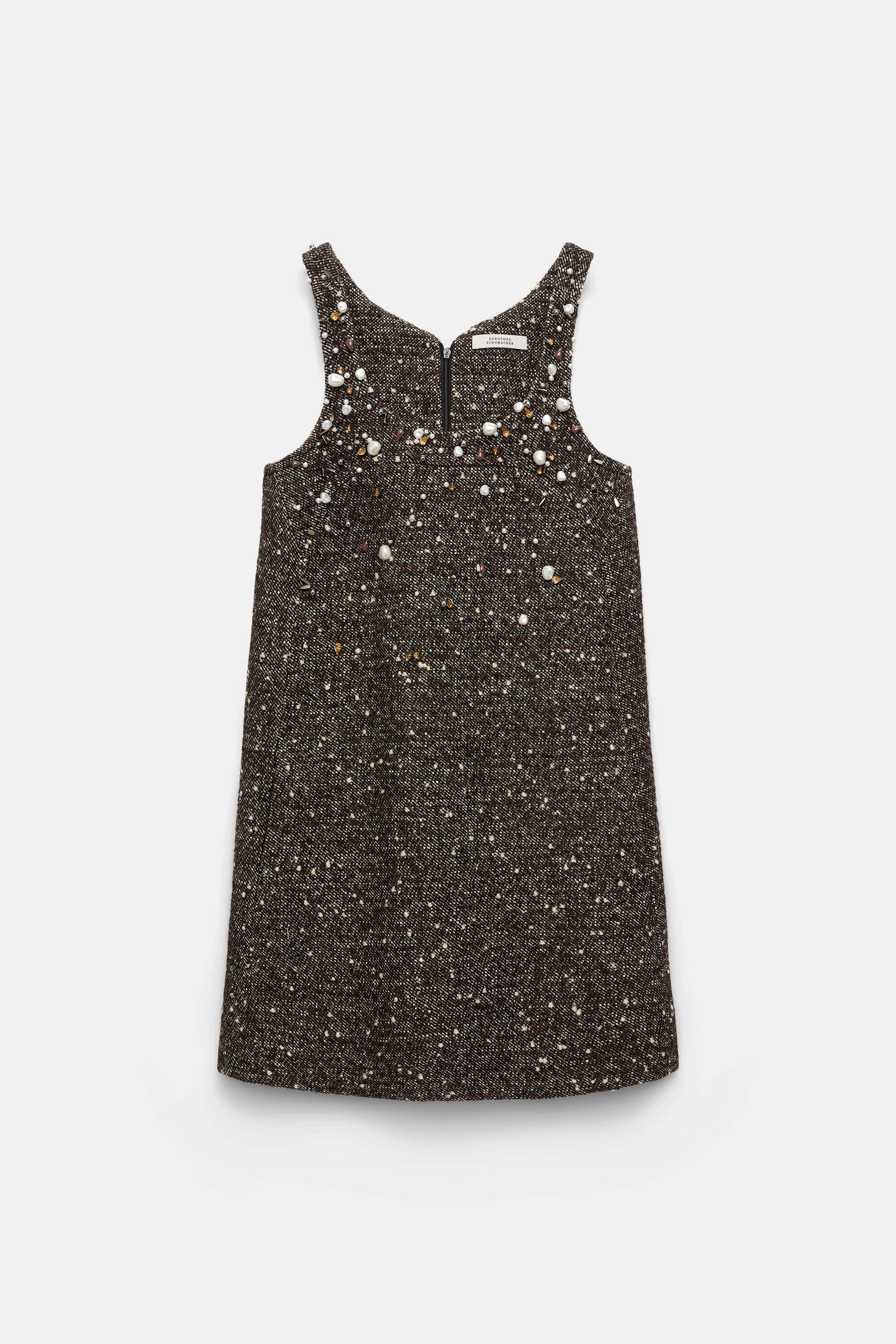 The tweed mini-dress has an A-line silhouette and sparkles with crystal and pearl bead embellishment. The dress has a scoop neckline in the front and pretty curved V back. Material & Care - 42 % Wool, 29 % Polyacrylic, 20 % Polyester, 6 % Polyamide, 3 % Other Fibres - Embellished A-line dress - Hand-embellished front with pearls and crystals - Accentuated topstitching - Fully lined - Hidden back zip closure - Hand wash cold / Machine wash old - Wash with similar colors Size & Fit - Our model is 180cm tall and wears a size 2 - Slight A-line
