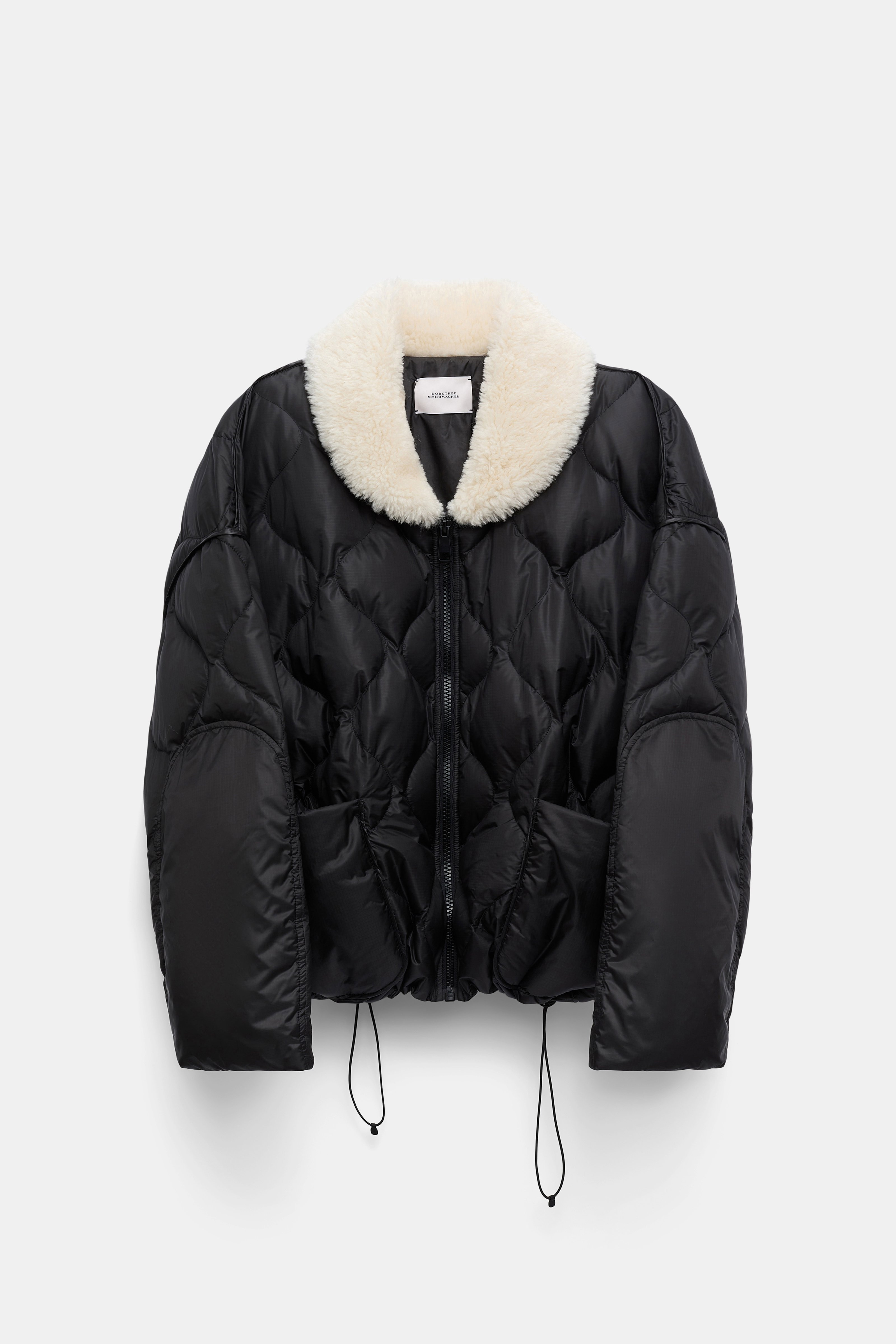 The quilted down jacket is slightly oversized and features a contrast shawl collar in faux fur. The cozy style has a zip front closure and drawstring waist pulls. Material & Care - 100 % Polyamide - Quilted down jacket with front zip closure - Contrast faux fur collar - Welt pockets - Patch pockets - Reinforced smooth patches on the sleeves - Drawstring hem Size & Fit - Slightly oversized