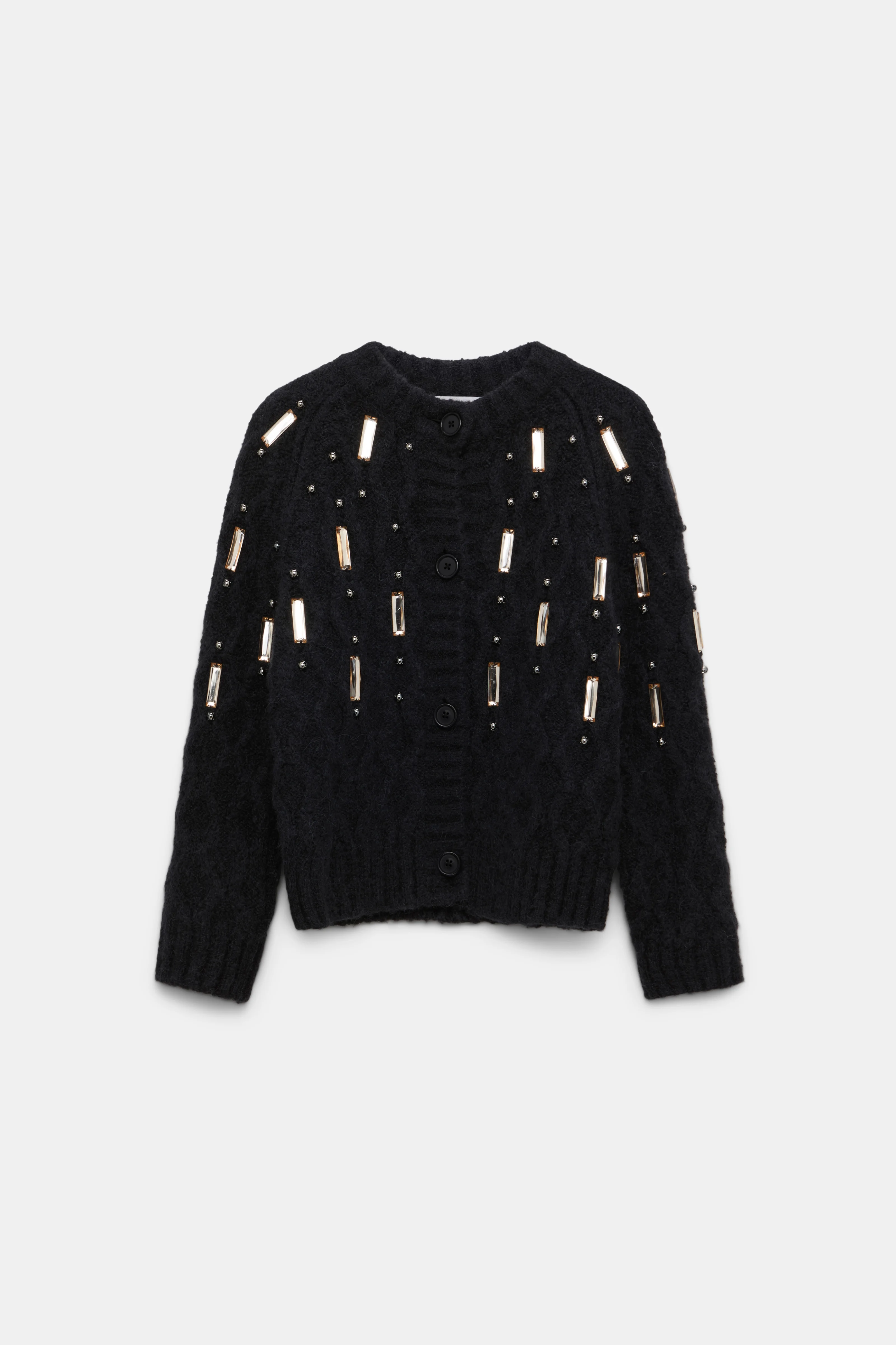 The graphic cable cardigan is knit is a soft alpaca-wool mix and is hand-embellished with crystals. The boxy style has raglan sleeves and a button front. Material & Care - 71 % Alpaca, 18 % Virgin Wool, 11 % Polyamide - Round neck cardigan - New alpaca yarn - Graphic cable patterning with hand-embroidered embellishment - Button closures - WE CARE - The wool content is mulesing-free - No dry cleaning - Hand wash cold / Machine wash cold - Wash with similar colors - Reshape in wet condition Size & Fit - Our Model is 179cm tall and wears a size 2. - Boxy cropped fit, fitted at the hem - Raglan sleeves