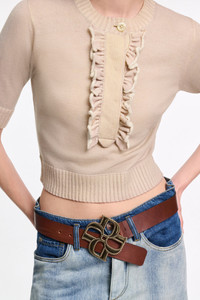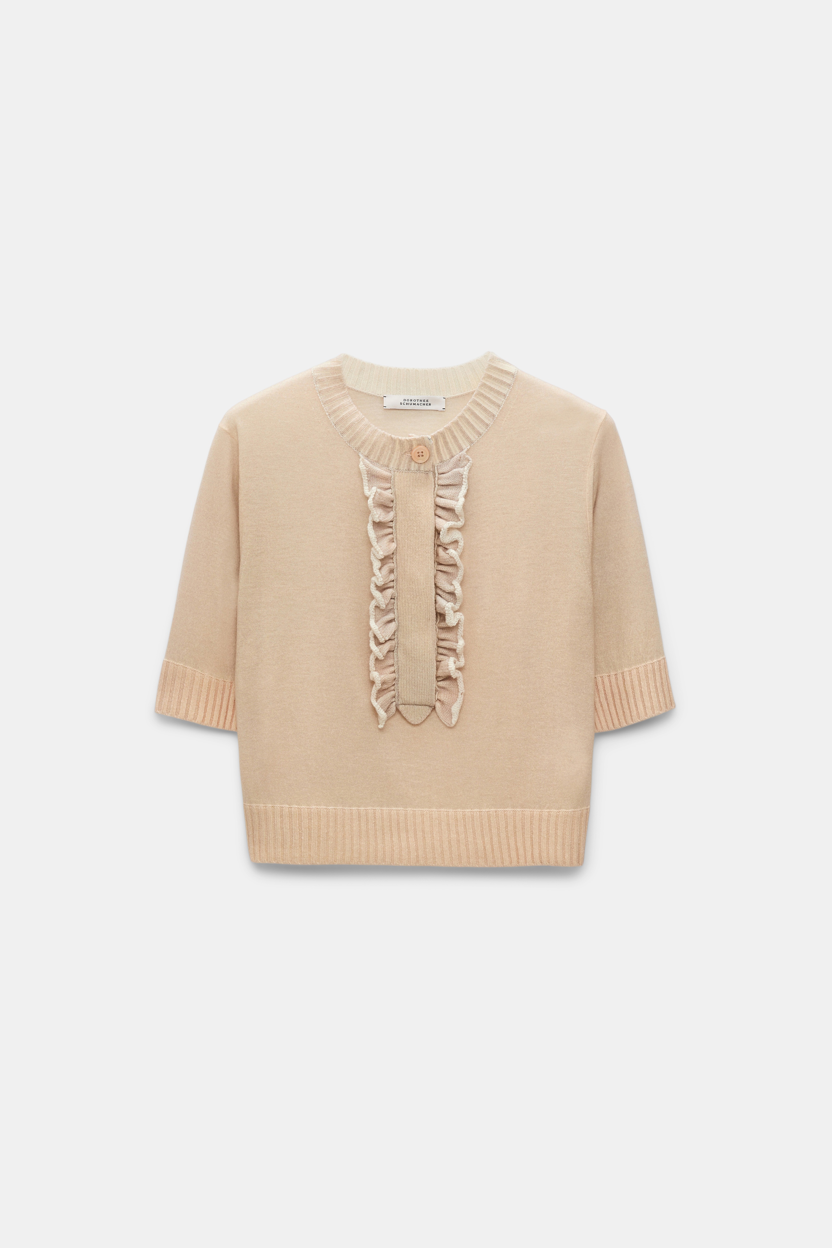 The half-sleeve knit top is made from a soft wool-cashmere mix and has a henley-style hidden buttons. Gathered ruffles trace both sides of the placket. Material & Care - 70 % Virgin Wool, 30 % Cashmere - Wool-cashmere knit top with cropped sleeves - Round neckline with top button closure - Concealed partial button placket with ruffle trim - Ribbed knit trim - WE CARE - The yarn is mulesing-free - Hand wash cold / Machine wash cold - Wash with similar colors - Contains non-textile parts of animal origin Size & Fit - Our model is 180cm tall and wears a size 2 - Loosely fitted