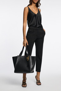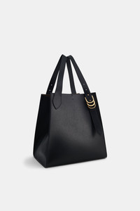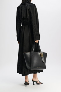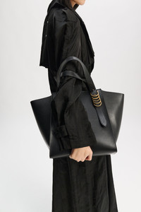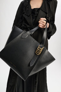 Embracing freedom and individuality. The Tote Bag is made in Italy from luxuriously soft calfskin. The roomy style has a leather tie closure on the top and calf suede lining with a leather zipper pocket attached. The bag can be styled with the sides pushed in or opened wide showcasing its full shape. Special D-ring hardware loosely attached to the straps references the designer's initials and symbolizes a sense of limitless possibilities. The hardware has mixed textures and a vintage gold-tone finish. The tote has adjustable straps and can be worn comfortably on the shoulder. Material & Care - 100 % Leather (calf) - Tote Bag in soft calf leather - Calf suede lining - Discrete logo lettering - Adjustable straps with push-stud hardware - Loosely attached D-ring hardware with mixed textures - Leather tie closure - Inside pocket with zip closure - Vintage gold-tone hardware and logo - Can be carried on the shoulder - Made in Italy Size & Fit - Dimensions: 32 cm (height) x 32 cm (length) x 21.5 (depth); handle drop: 20 cm