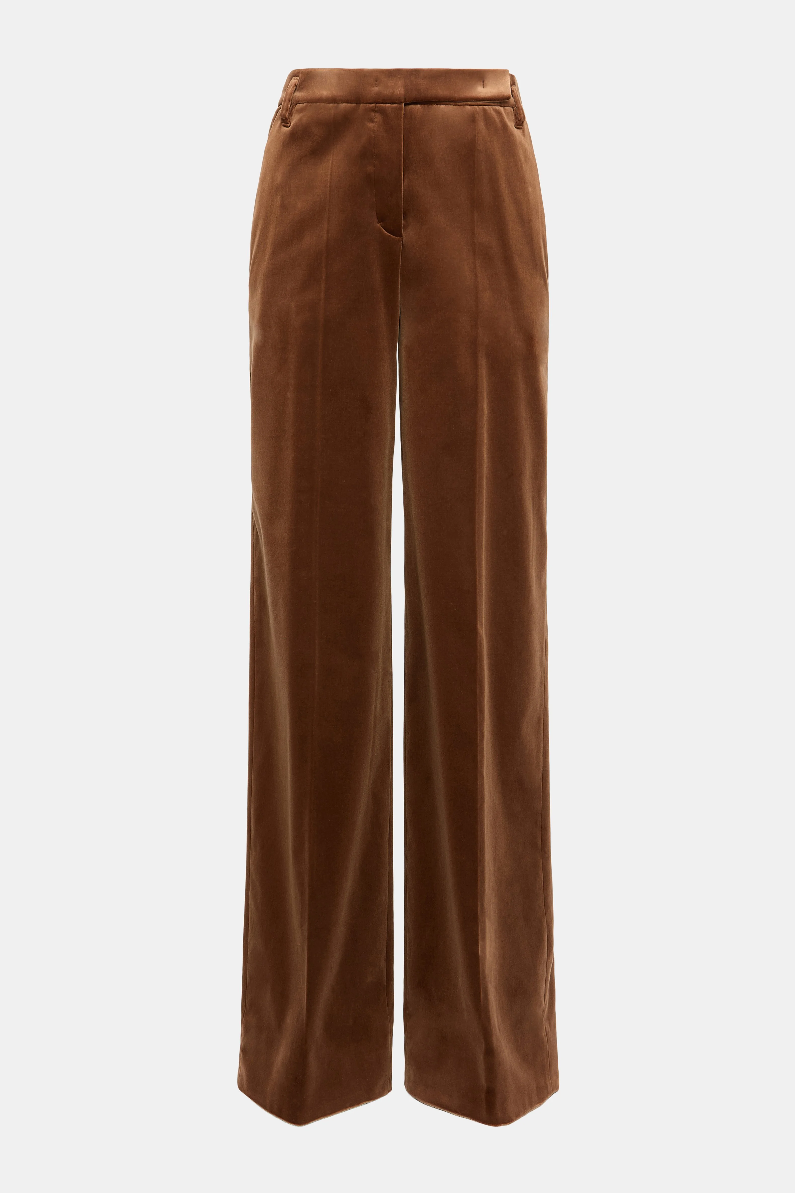 The softest suiting: The velvet pants are made from a stretch cotton mix and have side & back welt pockets. The wide leg style can be worn as a suit with the matching blazer. Material & Care - 70 % Cotton, 28 % Viscose, 2 % Elastane - Velvet trousers - Diagonal pockets - Waistband with extended tab closure - Belt loops - Back welt pockets - Dry clean only - No optical brighteners - Do not expose to extreme light - Shield from sharp items Size & Fit - Our Model is 178cm tall and wears a size 2. - Wide leg