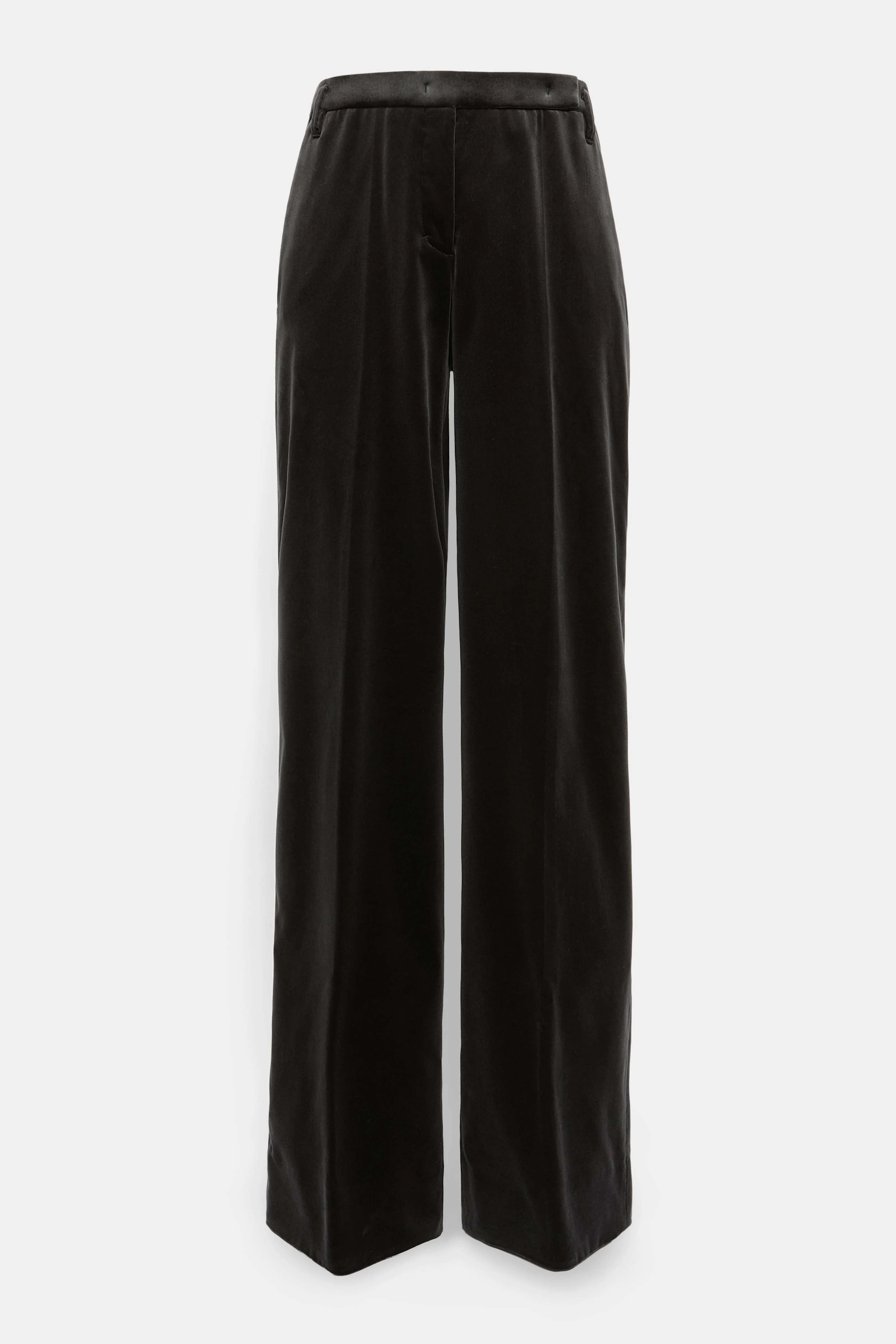 The softest suiting: The velvet pants are made from a stretch cotton mix and have side & back welt pockets. The wide leg style can be worn as a suit with the matching blazer. Material & Care - 70 % Cotton, 28 % Viscose, 2 % Elastane - Velvet trousers - Diagonal pockets - Waistband with extended tab closure - Belt loops - Back welt pockets - Dry clean only - No optical brighteners - Do not expose to extreme light - Shield from sharp items Size & Fit - Our Model is 178cm tall and wears a size 2. - Wide leg