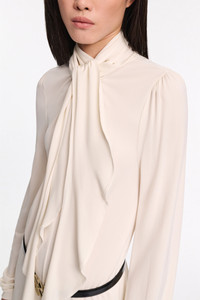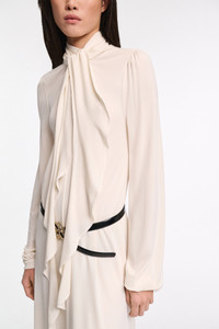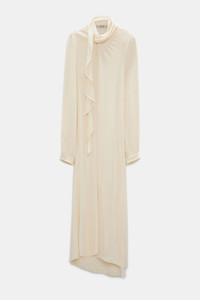 The dress is made from flowing crepe-jersey and has a flounce scarf draped around the neckline. The dress has long sleeves with fitted cuffs and a front slit with concealed snap closure. Material & Care - 100 % Viscose - Dress in flowing crepe-jersey - Draped flounce scarf with silk georgette trim - Center slit with concealed snap at the front - Generous blouse sleeves with fitted cuffs - Gathered shoulders - Asymmetric draped hem - WE CARE - This item is finished according to STANDARD 100 by OEKO-TEX, 22.0.98928 Hohenstein HTTI - Hand wash cold / Machine wash cold - Wash with similar colors Size & Fit - Our model is 178cm tall and wears a size 2 - Fitted at the shoulders - Flared silhouette with generous volume