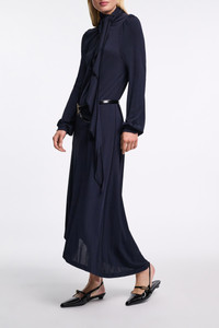The dress is made from flowing crepe-jersey and has a flounce scarf draped around the neckline. The dress has long sleeves with fitted cuffs and a front slit with concealed snap closure. Material & Care - 100 % Viscose - Dress in flowing crepe-jersey - Draped flounce scarf with silk georgette trim - Center slit with concealed snap at the front - Generous blouse sleeves with fitted cuffs - Gathered shoulders - Asymmetric draped hem - WE CARE - This item is finished according to STANDARD 100 by OEKO-TEX, 22.0.98928 Hohenstein HTTI - Hand wash cold / Machine wash cold - Wash with similar colors Size & Fit - Our model is 178cm tall and wears a size 2 - Fitted at the shoulders - Flared silhouette with generous volume