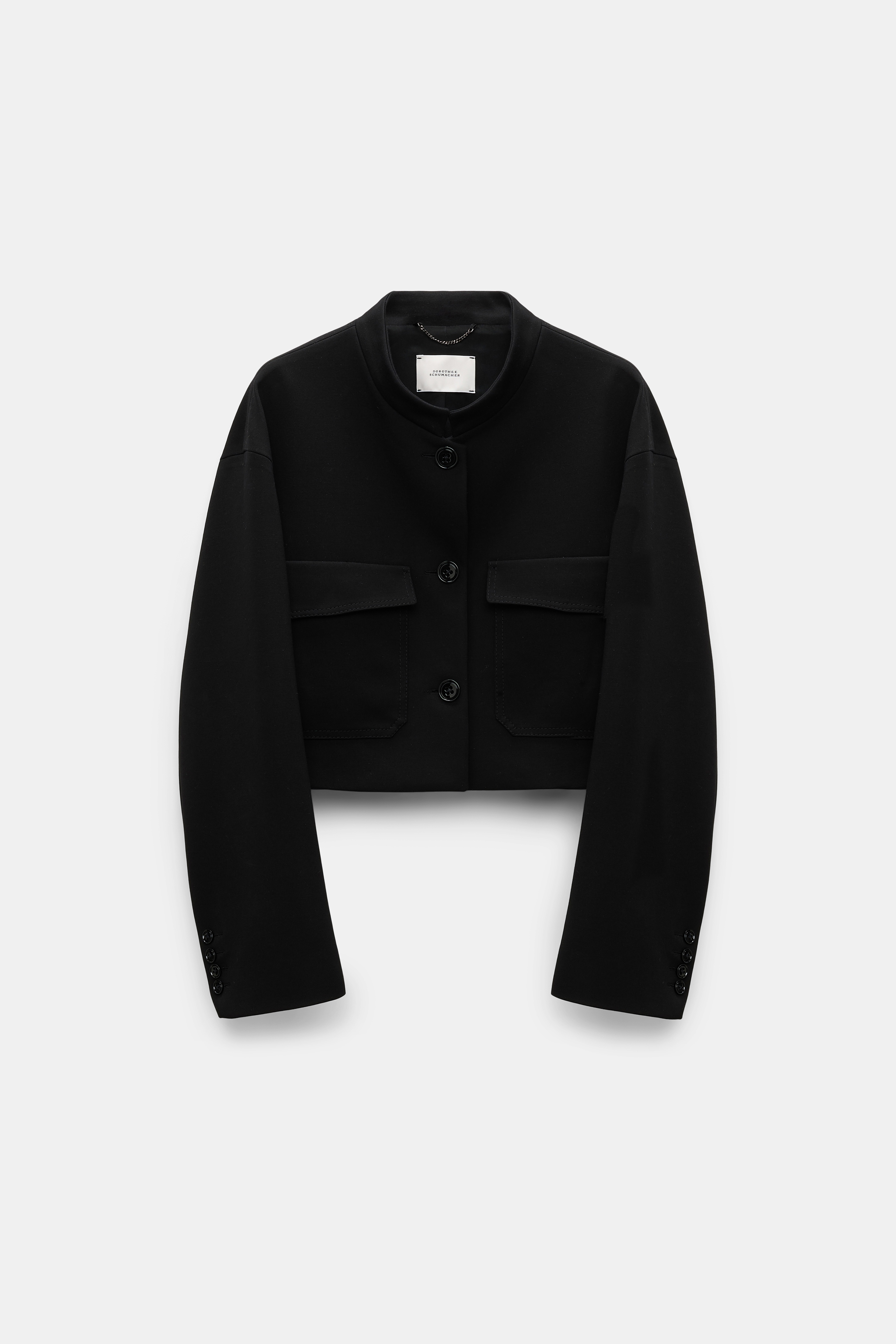 Styled in our forever favorite Punto Milano, the cropped jacket features clean lines and a short stand collar. The jacket has flap pockets and can be paired with matching pants for a suit look. Material & Care - 67 % Viscose, 28 % Polyamide, 5 % Elastane - Cropped jacket in Punto Milano - Stand collar - Flap pockets - Slit cuffs - Button closures - Dry clean only - No optical brighteners - Do not expose to extreme light - Shield from sharp items Size & Fit - Our model is 180cm tall and wears a size 2 - Boxy, cropped silhouette