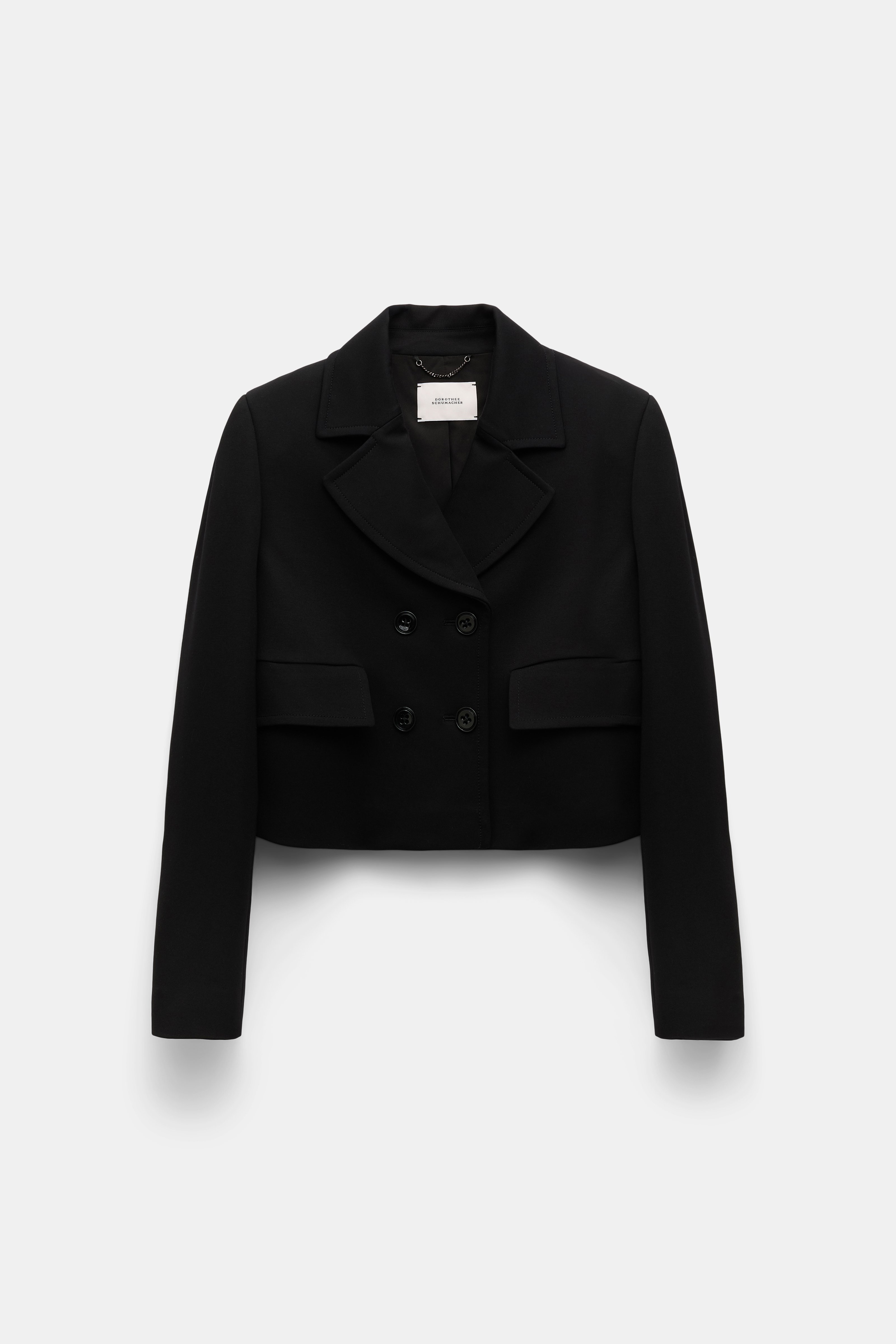 The cropped blazer has a boxy cut and is detailed in our forever favorite Punto Milano. The jacket has flap pockets and double-breasted button closures. Pair with the matching pants for a suit look. Material & Care - 67 % Viscose, 28 % Polyamide, 5 % Elastane - Cropped blazer in Punto Milano - Notched collar - Double-breasted - Flap pockets - Fully lined Size & Fit - Our model is 180cm tall and wears a size 2 - Boxy shape
