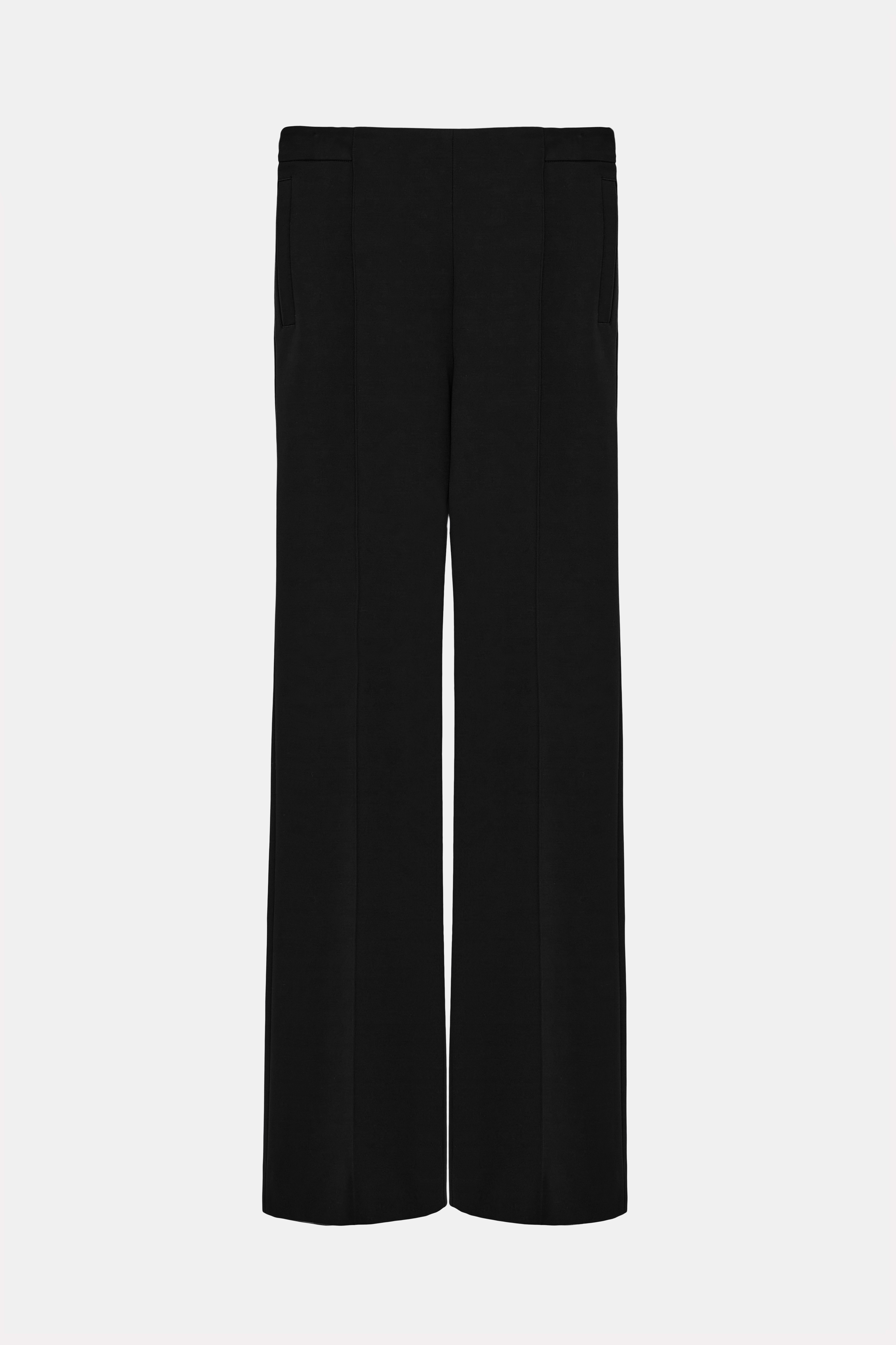 The flared pants are crafted in Punto Milano and have pintucks on the front. The pants can be worn as a suit with a matching Punto Milano blazer. Material & Care - 67 % Viscose, 28 % Polyamide, 5 % Elastane - Flared pants in Punto Milano - Pintucks on the front of the leg - Hidden fly and top closure - Slanted side pockets - Back welt pockets - Belt loops - Hand wash programme / Machine wash - Wash with similar colours Size & Fit - Our model is 181 cm tall and wears a size S - Fitted - Flared leg