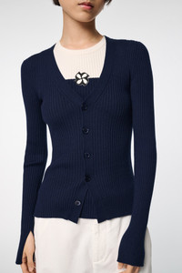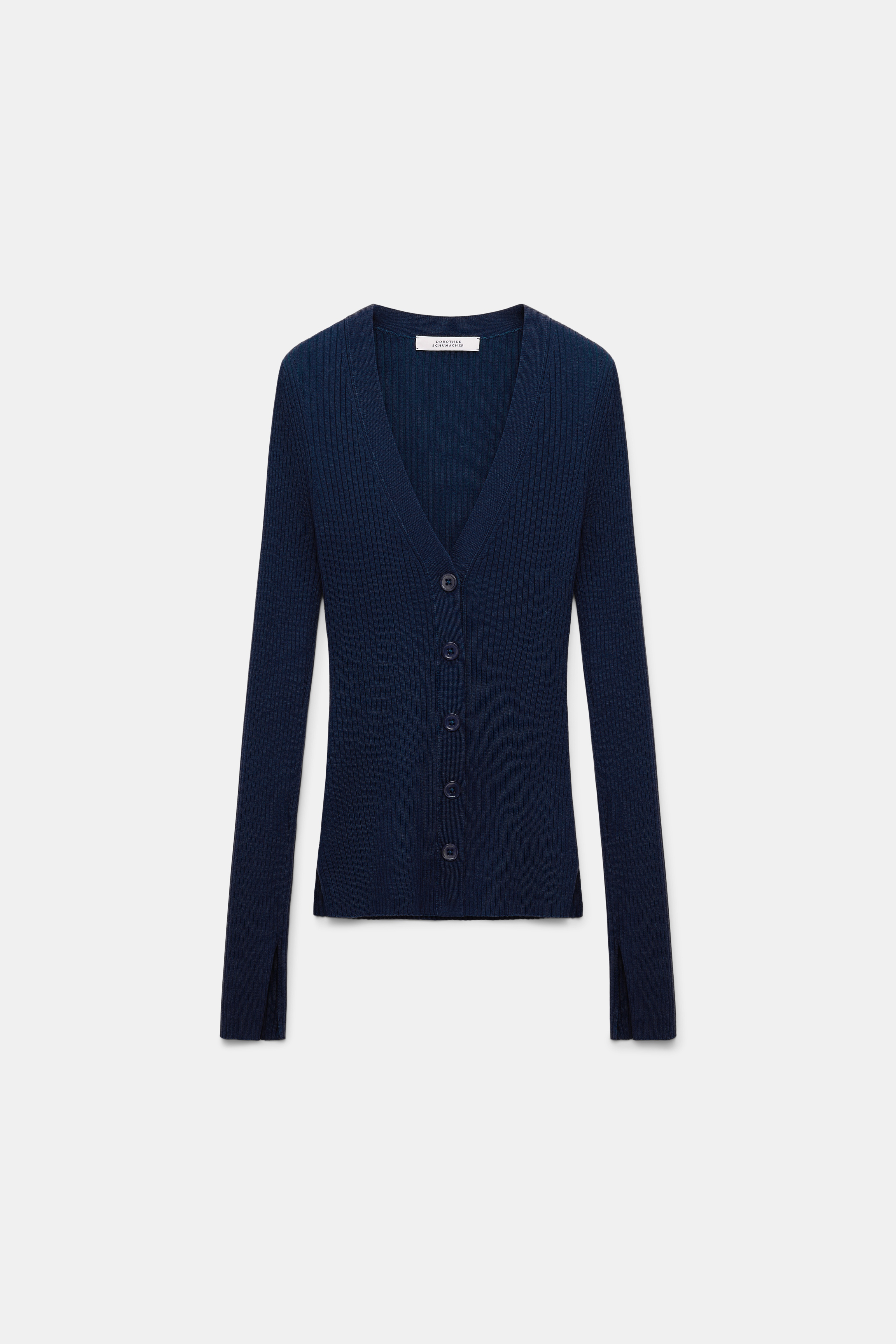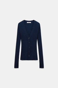 The V-neck cardigan is made from a stretchy ribbed wool-silk blend. The fitted style has small slits on the sleeve cuffs and hem. Material & Care - 59 % Wool, 20 % Silk, 18 % Polyamide, 3 % Elastane - Wool-silk blend ribbed cardigan - V-neckline - Small slits on the cuffs and hem Size & Fit - Our model is 179 cm tall and wears a size S - Fitted - Fitted shoulders - Fitted sleeves