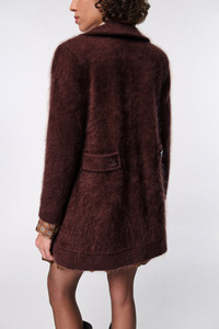 Cozy comes to mind: The coat has a wide collar and is knit in a soft cashmere-Merino wool mix. Our fluffy wash gives the loosely fitted style an extra soft feel. Material & Care - 67 % Virgin wool (Merino), 28 % Cashmere, 4 % Polyamide, 1 % Elastane - Coat with wide collar - “Fluffy knit” wash, pleated with elastane - Topstitch finishing - Flap pockets, latch at the back - Shoulder pads - Button closures - WE CARE - The wool content is mulesing-free - Dry clean only - No optical brighteners - Do not expose to extreme light - Shield from sharp items - Learn more about Materials & Care Size & Fit - Our Model is 176cm tall and wears a size 2. - Straight. loosely fitted shape - Fitted shoulders - Classic sleeves