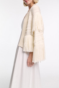 The cape style cardigan is made from soft virgin Merino wool and has a mix of fringe and tactile relief knit patterning. The relaxed silhouette has an open draped front and wide raglan sleeves. Material & Care - 100 % Virgin wool (Merino) - Cape-style cardigan in virgin Merino wool - Open front with ribbed knit trim - Striking layers of fringe - Irregular relief knit patterning - WE CARE - The yarn is mulesing-free - Dry clean only - No optical brighteners - Do not expose to extreme light - Shield from sharp items Size & Fit - Our model is 180cm tall and wears a size 2 - Relaxed fit - Wide raglan sleeves - Sleeves are fixed on the inside with a ribbon