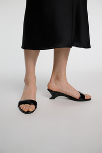 The shiny patent leather sandals feature a single strap with a matching enamel D-rose stud. The slides have a leather footbed and contour wedges. Material & Care - 100 % Leather (calf) - Slides with contour wedges - Patent leather calfskin uppers - Goatskin footbed - Padded strap with bombatura effect - Tonal D-rose enamel studs - Tonal heel with graphic silhouette - Shiny leather sole Size & Fit - Fits true to size - Available in half sizes