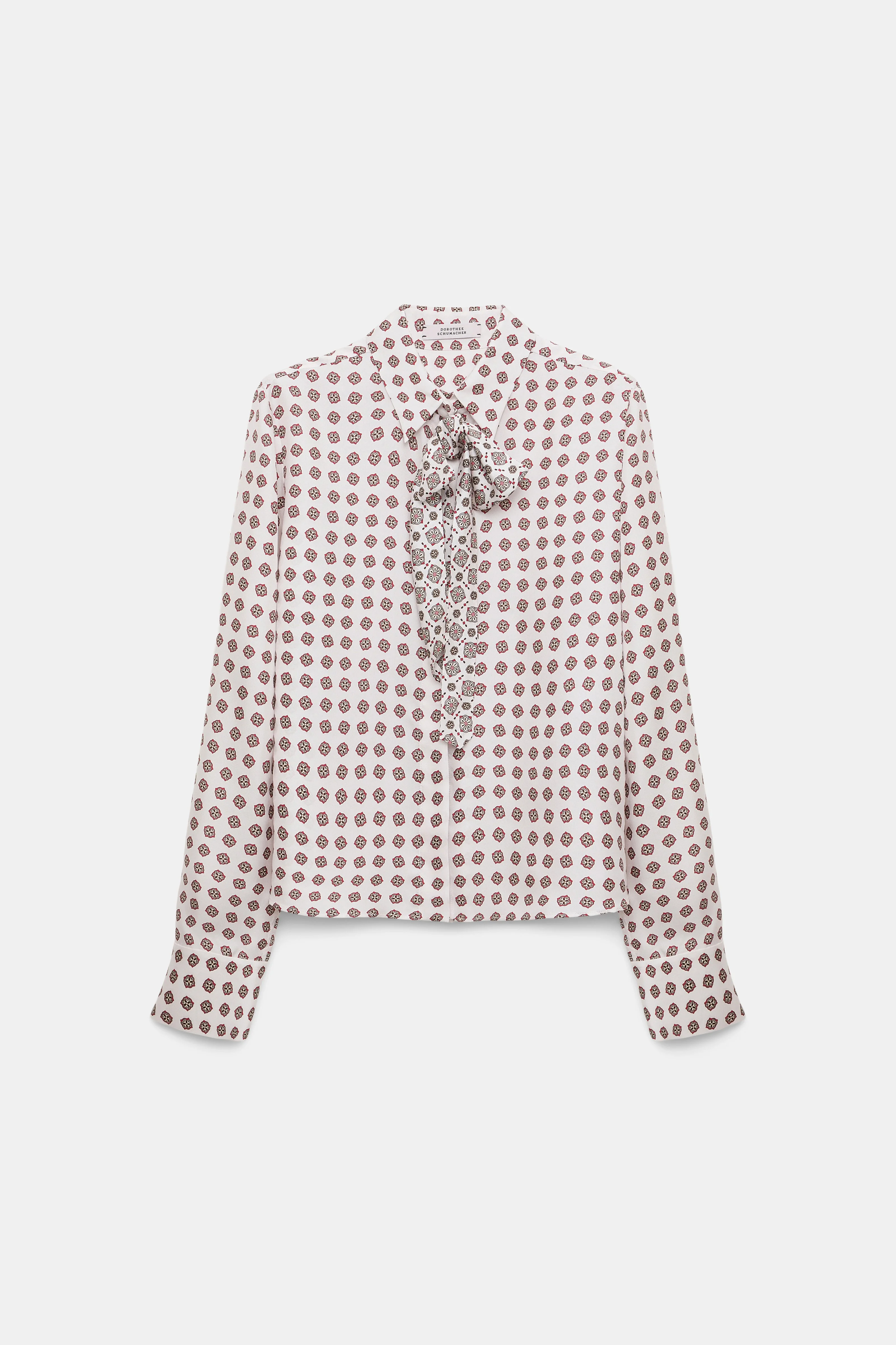 Signature prints, signature style: The blouse has a relaxed fit and features our signature tie prints. The blouse is made from silk twill and has a removable tie around the neckline. Material & Care - 100 % Silk - Printed silk twill blouse - Signature tie prints - Removable tie bow in contrast print - Classic shirt collar - Hidden button placket - Back yoke with inverted pleat - Hand wash program / Machine wash - Wash with similar colors - Remove all detachable parts before cleaning Size & Fit - Our Model is 178cm tall and wears a size 2. - Fitted shoulders - Relaxed fit - Straight silhouette