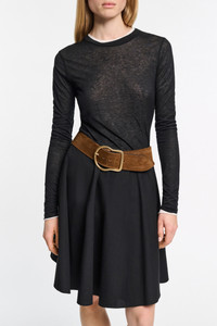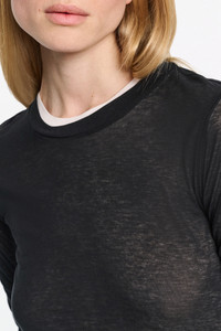 The double layer fine jersey T-shirt has a round neckline and extra long sleeves. The comfortable style has a back seam with a soft gathered drape. Material & Care - 70 % Lyocell, 30 % Cotton - Double layer fine single jersey long sleeve T-shirt - Round neckline with fine rib trim - Coverlock seams - Center back seam with soft gathered drape - Raw edges - WE CARE - This item is finished according to STANDARD 100 by OEKO-TEX, 22.0.98928 Hohenstein HTTI - Hand wash program / Machine wash - Wash with similar colors Size & Fit - Our model is 179cm tall and wears a size S - Casual, fitted shoulders - Loosely fitted - Extra long sleeves