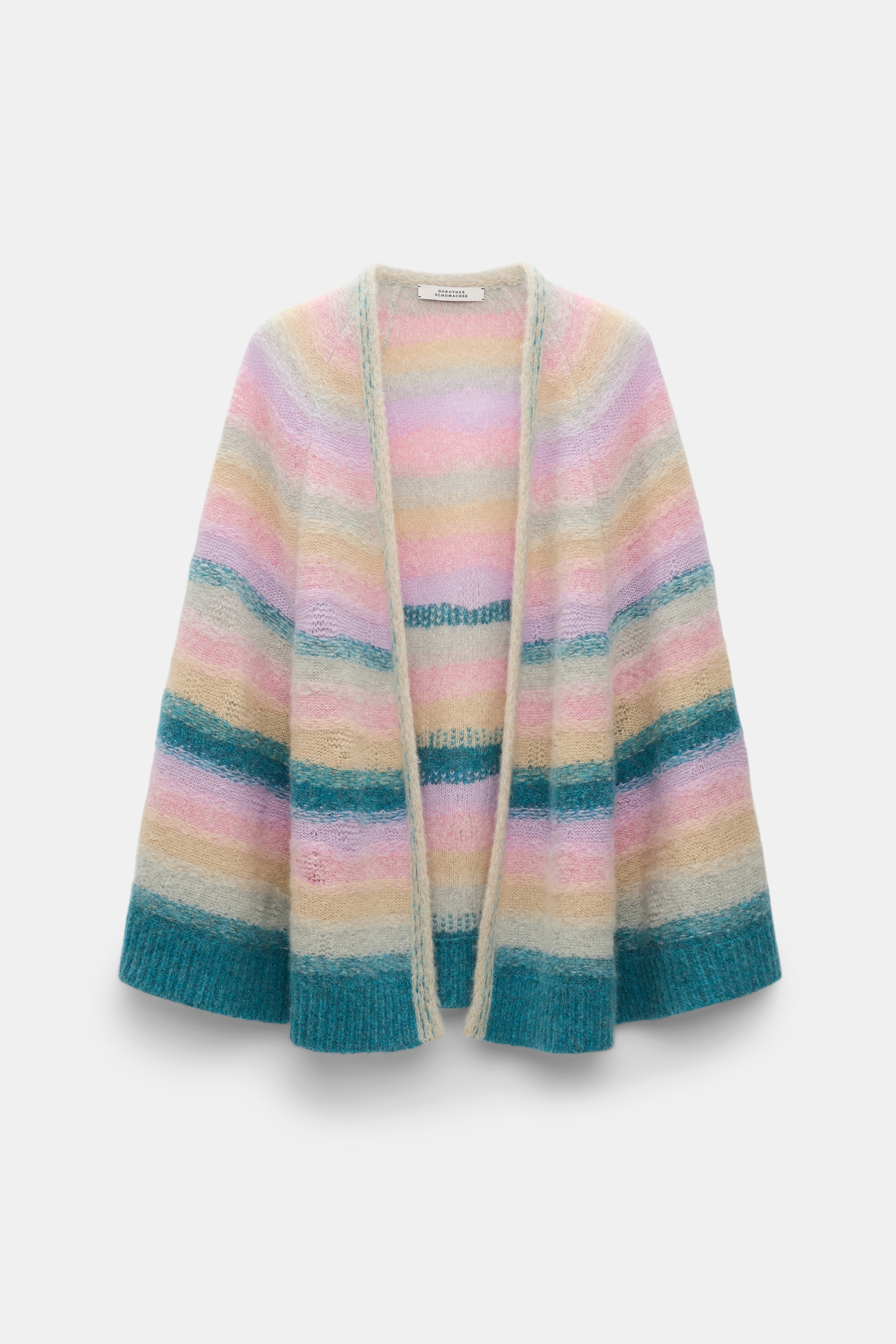 The softest stripes we could make: The cape-like cardigan is knit in plush new cashmere yarn and has an open front. The hybrid style features a textured surface feel and stripes which fade seamlessly into each other. Material & Care - 100 % Cashmere - Extra soft cashmere cape-style cardigan with bright stripes - Special knitting technique creates a color fading stripe pattern - Unique, textured relief effect with artisanal knit stitching - Chunky rib knit trim - WE CARE - This item is finished according to STANDARD 100 by OEKO-TEX, 22.0.98928 Hohenstein HTTI - Hand wash cold / Machine wash cold - Wash with similar colors Size & Fit - Our model is 178cm tall and wears a size 2 - Wide raglan sleeves with trompe-l’oeil effect - Sleeves are fixed on the inside with a ribbon - Falls to the hip