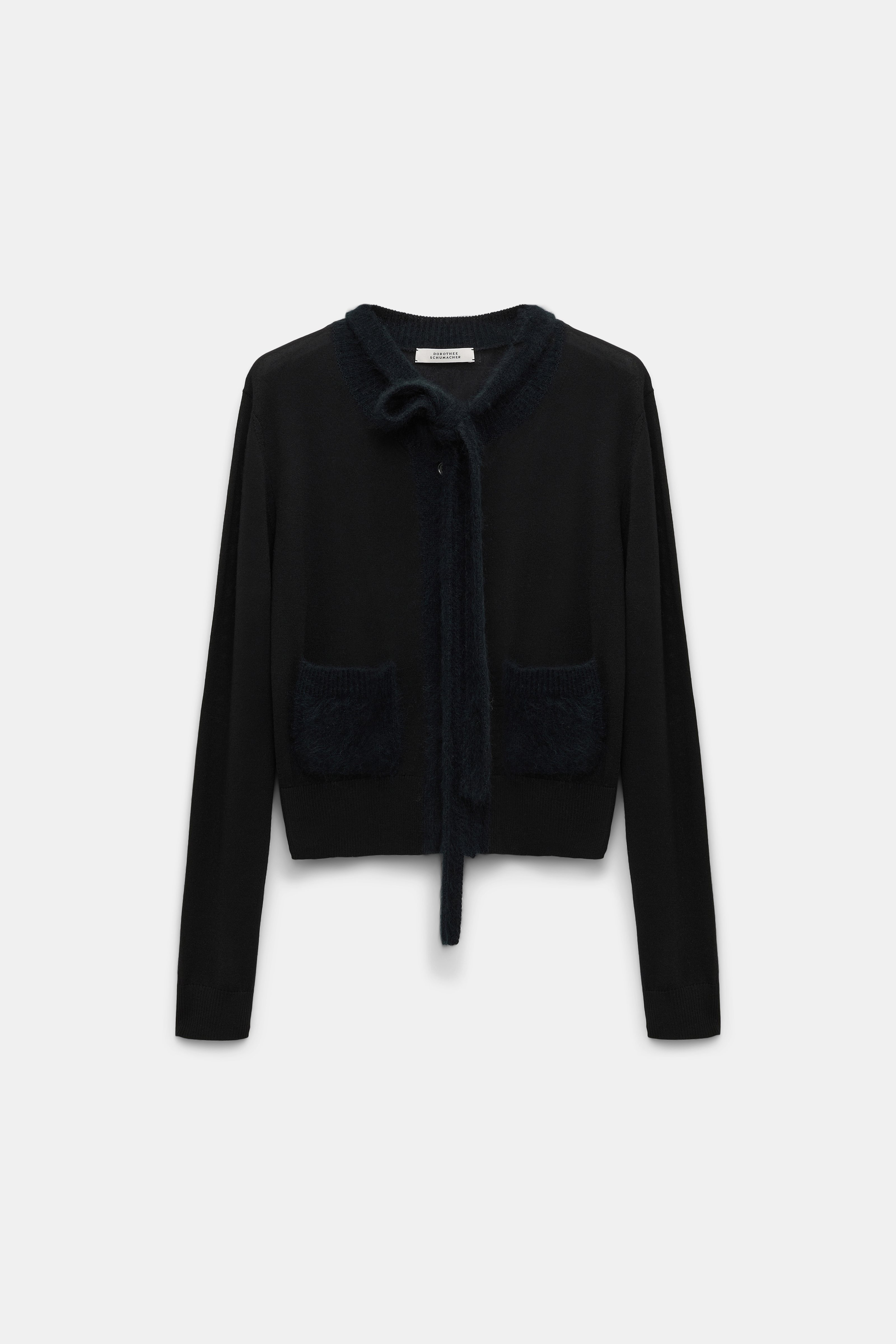 The cropped cardigan is knit in virgin Merino wool and features a tie neckline & detailing in our softest, fluffy wash finish Merino-cashmere mix. Material & Care - 86 % Virgin wool (Merino), 10 % Cashmere, 3 % Polyamide, 1 % Elastane - Virgin Merino round neck cardigan - Ribbon, neckline, button placket and pockets in “fluffy knit” wash Merino-cashmere - WE CARE - The wool content is mulesing-free - WE CARE - This item is finished according to OEKO-TEX® STANDARD 100, 22.0.98928 Hohenstein - Hand wash cold / Machine wash old - Wash with similar colors Size & Fit - Our model is 180cm tall and wears a size 2 - Cropped, loosely fitted - Slight dropped shoulders