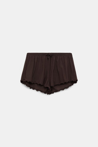 The lingerie shorts are made from technical jersey and have natural ruffle trim. The shorts can be worn as a set with the matching camisole. Material & Care - 73 % Polyamide, 27 % Elastane - Technical jersey lingerie shorts - Baby overlock edge finishing - Elastic waistband with zigzag stitching - WE CARE - This item is finished according to OEKO-TEX® STANDARD 100, 22.0.98928 Hohenstein - Hand wash cold / Machine wash old - Wash with similar colors Size & Fit - Our model is 179cm tall and wears a size 2 - Elastic waist - Loosely fitted leg