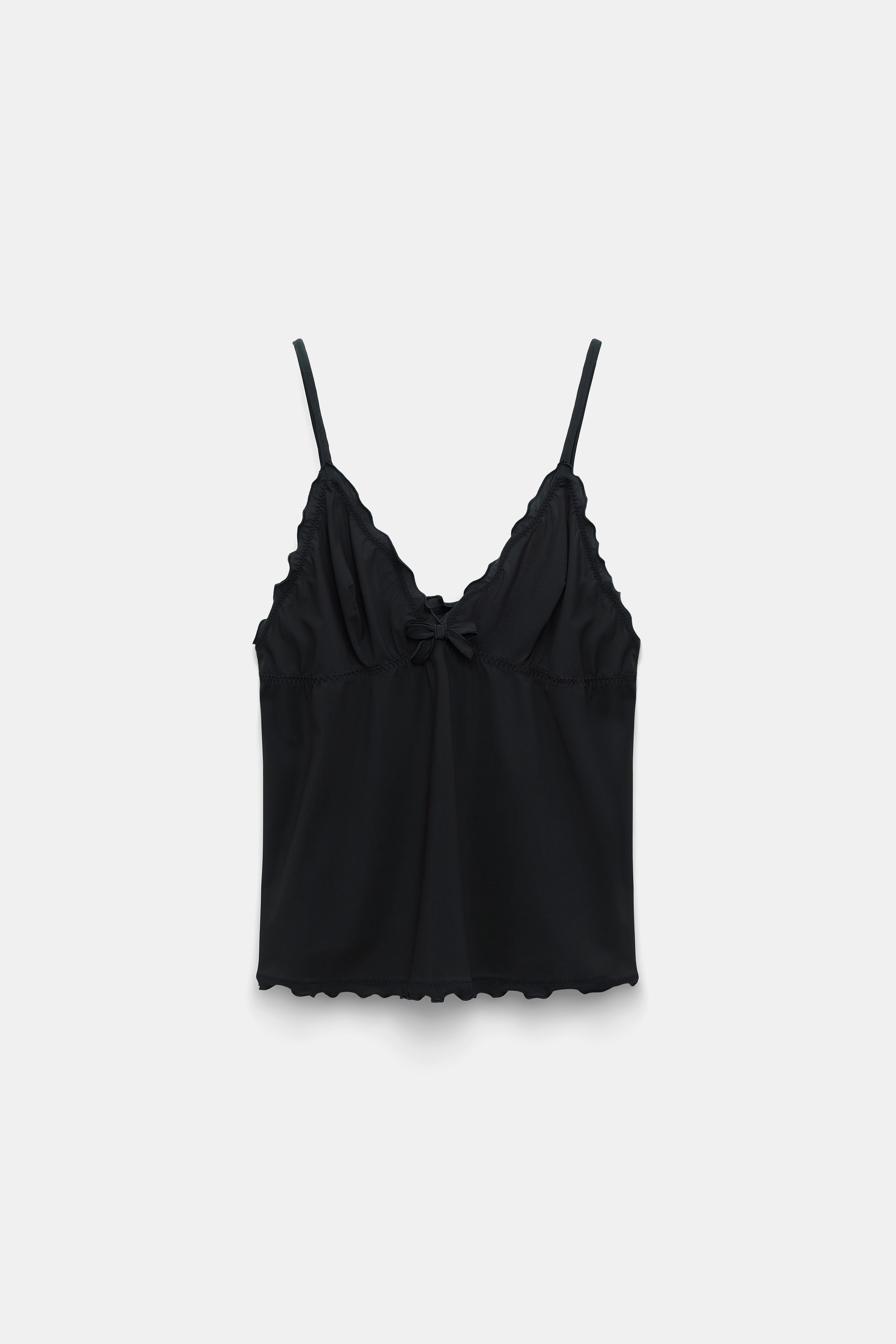 The camisole is made from technical jersey and has natural ruffle trim. The cami can be worn as a set with the matching shorts. Material & Care - 73 % Polyamide, 27 % Elastane - Technical jersey camisole - Baby overlock edge finishing - Small bow at the center front - Adjustable straps - Hand wash cold / Machine wash old - Wash with similar colors Size & Fit - Our model is 180cm tall and wears a size 2 - Form-fitting - Slight flared hem