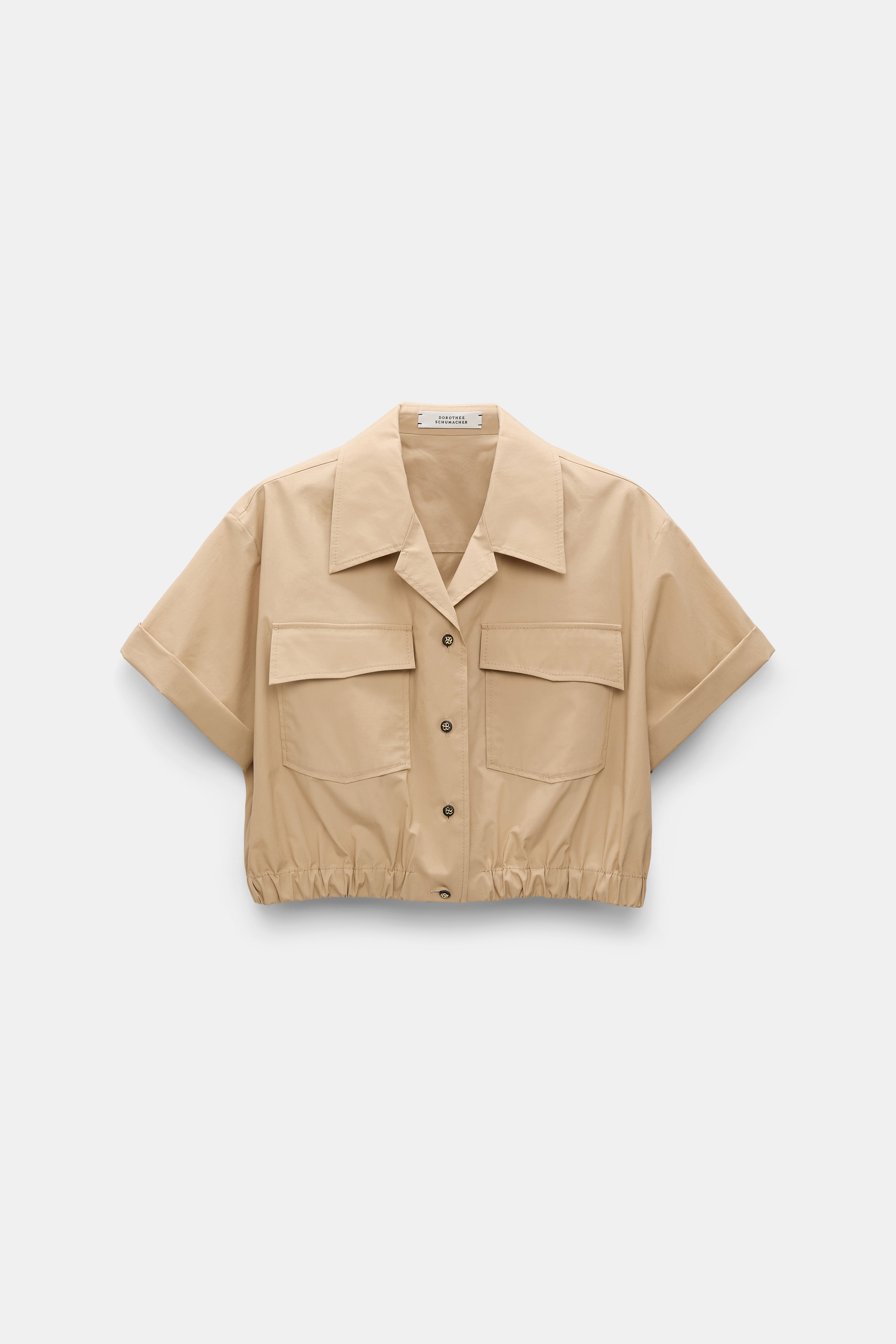 The cotton poplin blouse features an open collar and flap pockets. The cropped style has an elastic waist and D-rose deatiling on the buttons. For a layered look, pair with the cotton poplin midi-dress. Material & Care - 96 % Cotton, 4 % Elastane - Cropped, short sleeve blouse in cotton poplin - Elastic hem - Petite notched collar - Flap pockets - Buttons with D-rose detail - WE CARE - This item is finished according to STANDARD 100 by OEKO-TEX, 22.0.98928 Hohenstein HTTI - Hand wash program / Machine wash - Wash with similar colors Size & Fit - Our model is 178cm tall and wears a size 2 - Boxy - Cropped - Slight dropped shoulders