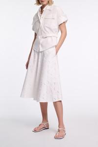 The cotton poplin blouse features an open collar and flap pockets. The cropped style has an elastic waist and D-rose deatiling on the buttons. For a layered look, pair with the cotton poplin midi-dress. Material & Care - 96 % Cotton, 4 % Elastane - Cropped, short sleeve blouse in cotton poplin - Elastic hem - Petite notched collar - Flap pockets - Buttons with D-rose detail - WE CARE - This item is finished according to STANDARD 100 by OEKO-TEX, 22.0.98928 Hohenstein HTTI - Hand wash program / Machine wash - Wash with similar colors Size & Fit - Our model is 180cm tall and wears a size 2 - Boxy - Cropped - Slight dropped shoulders