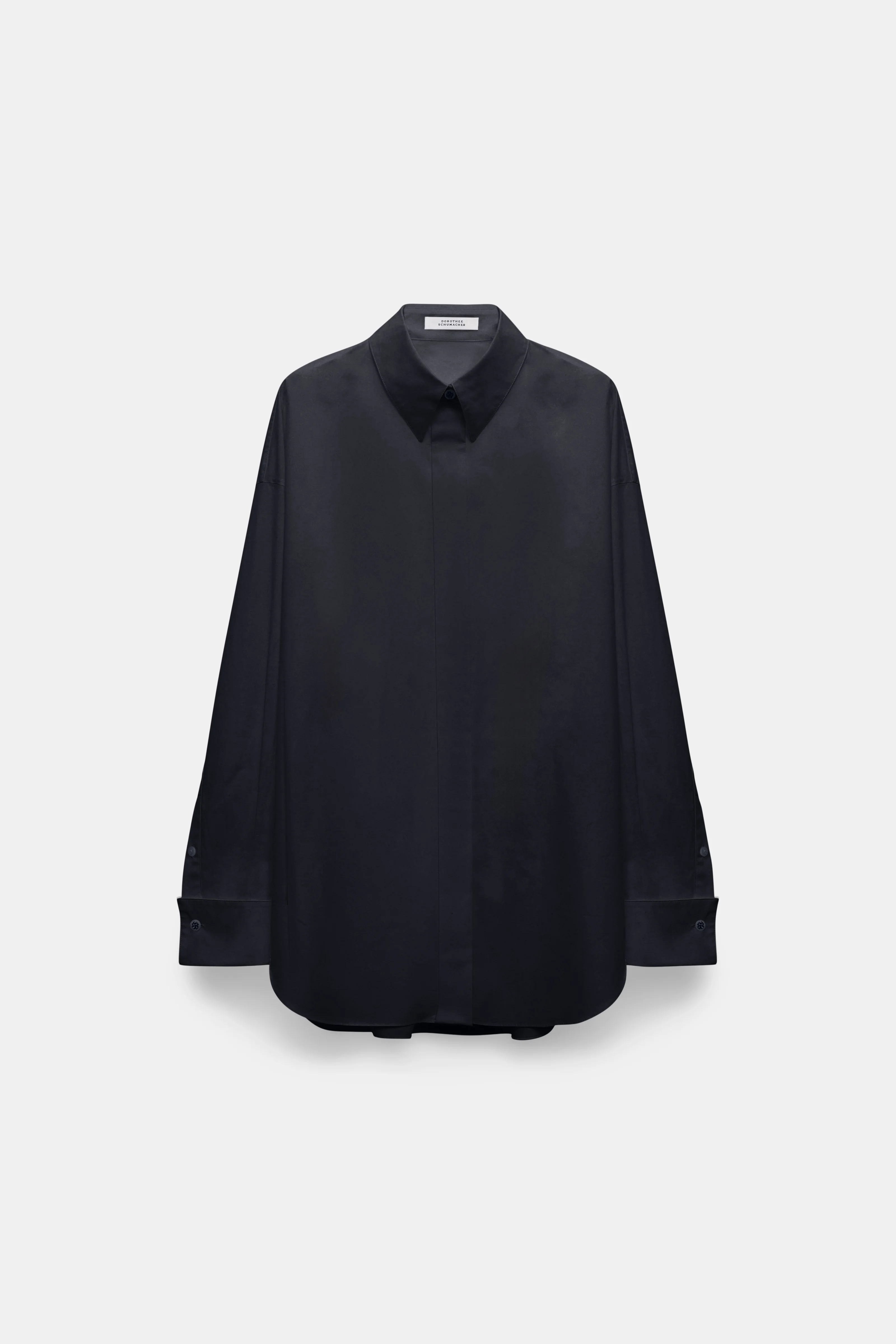 The shirt has a casual, oversized fit and is finished with D-Rose details. The cotton poplin essential has French cuffs, a concealed button placket, and a button-down collar. Material & Care - 96 % Cotton, 4 % Elastane - Cotton-poplin shirt - French cuffs with D-rose cufflinks - Hidden button placket - Button-down collar Size & Fit - Oversized - Relaxed fit - Dropped shoulders