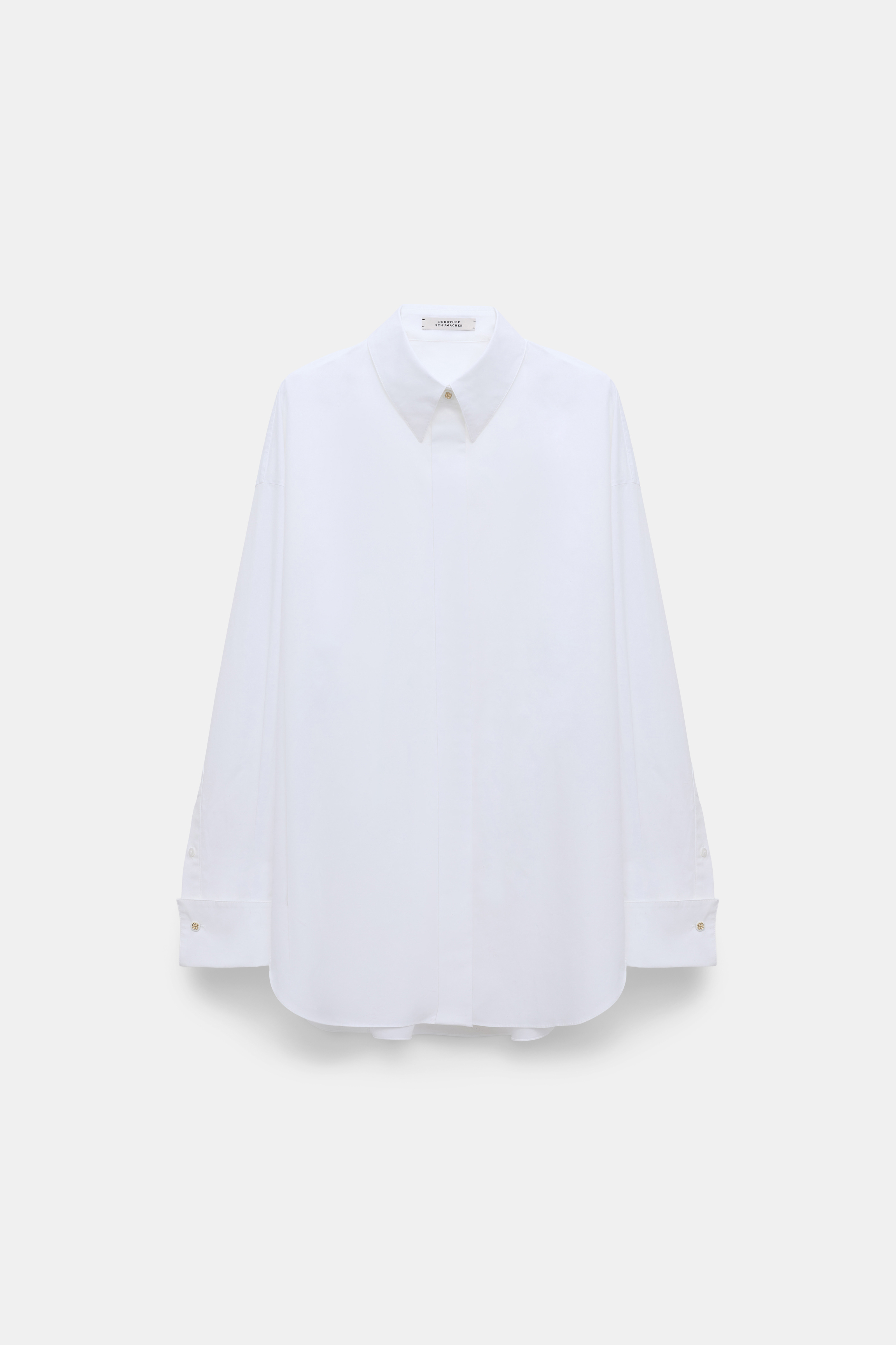 The shirt has a casual, oversized fit and is finished with D-Rose details. The cotton poplin essential has French cuffs, a concealed button placket, and a button-down collar. Material & Care - 96 % Cotton, 4 % Elastane - Cotton-poplin shirt - French cuffs with D-Rose cufflinks - Hidden button placket - Button-down collar Size & Fit - Dropped shoulders - Oversized - Relaxed fit