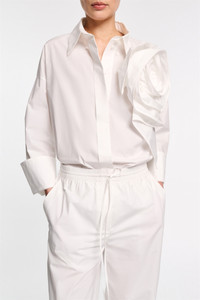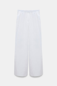 Doesn't get much easier than this: The cotton poplin pants have a relaxed leg and elastic drawstring waist. A faux fly gives the pants a neat tailored look. Please note that this style comes with an unfinished hemline so you can custom tailor to your desired length. Material & Care - 96 % Cotton, 4 % Elastane - Relaxed cotton poplin pants - Elastic drawstring waist - Faux fly - Side and back pockets - Comes with an unfinished hemline so you can custom tailor to your desired length - WE CARE - This item is finished according to STANDARD 100 by OEKO-TEX, 22.0.98928 Hohenstein HTTI - Hand wash program / Machine wash - Wash with similar colors Size & Fit - Our model is 178 cm tall and wears a size S - Wide leg - Relaxed fit - Slight dropped crotch
