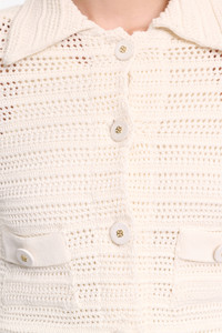 The cropped jacket is knit in a stretch cotton mix and has allover graphic pointelle patterning. The fitted style has pockets, half sleeves and a pointed collar. Material & Care - 69 % Cotton, 30 % Polyamide, 1 % Elastane - Graphic pointelle knit jacket in stretch cotton mix - Pointed collar - Satin-covered buttons with D-rose detail - Buttoned flap pockets - Padded shoulders - Dry clean only - No optical brighteners - Do not expose to extreme light - Shield from sharp items Size & Fit - Our model is 180cm tall and wears a size 2 - Fitted - Cropped - Fitted shoulders - Fitted sleeves