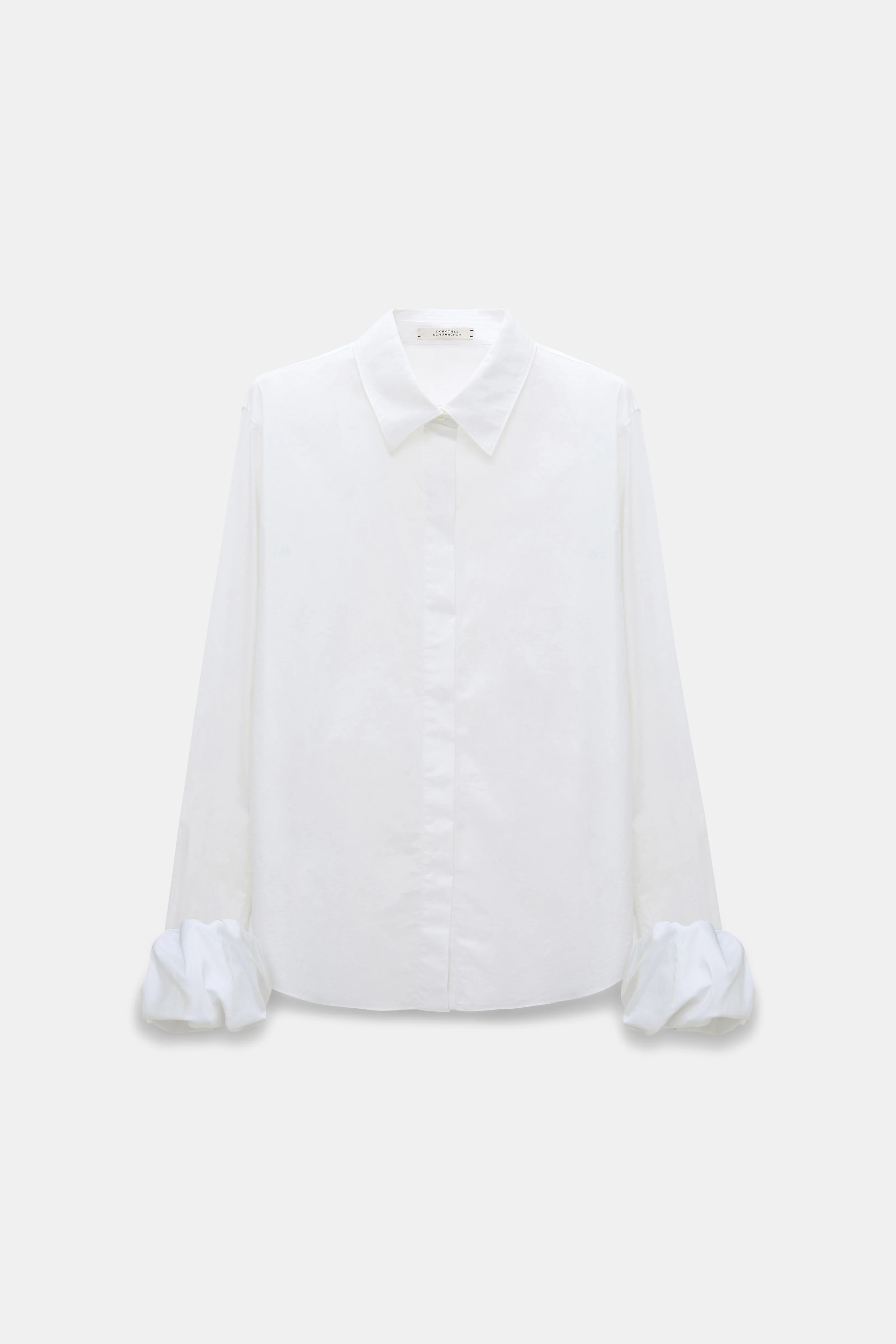 Feminine energy incoming...The cotton poplin blouse features twisted balloon cuffs in Duchesse. The shirt has a slim fit. Material & Care - 97 % Cotton, 3 % Elastane - Cotton poplin blouse - Twisted balloon cuffs in Duchesse - Classic shirt collar - Hidden button placket - Hand wash program / Machine wash - Wash with similar colors Size & Fit - Our Model is 178cm tall and wears a size 2. - Slim silhouette - Fitted shoulders