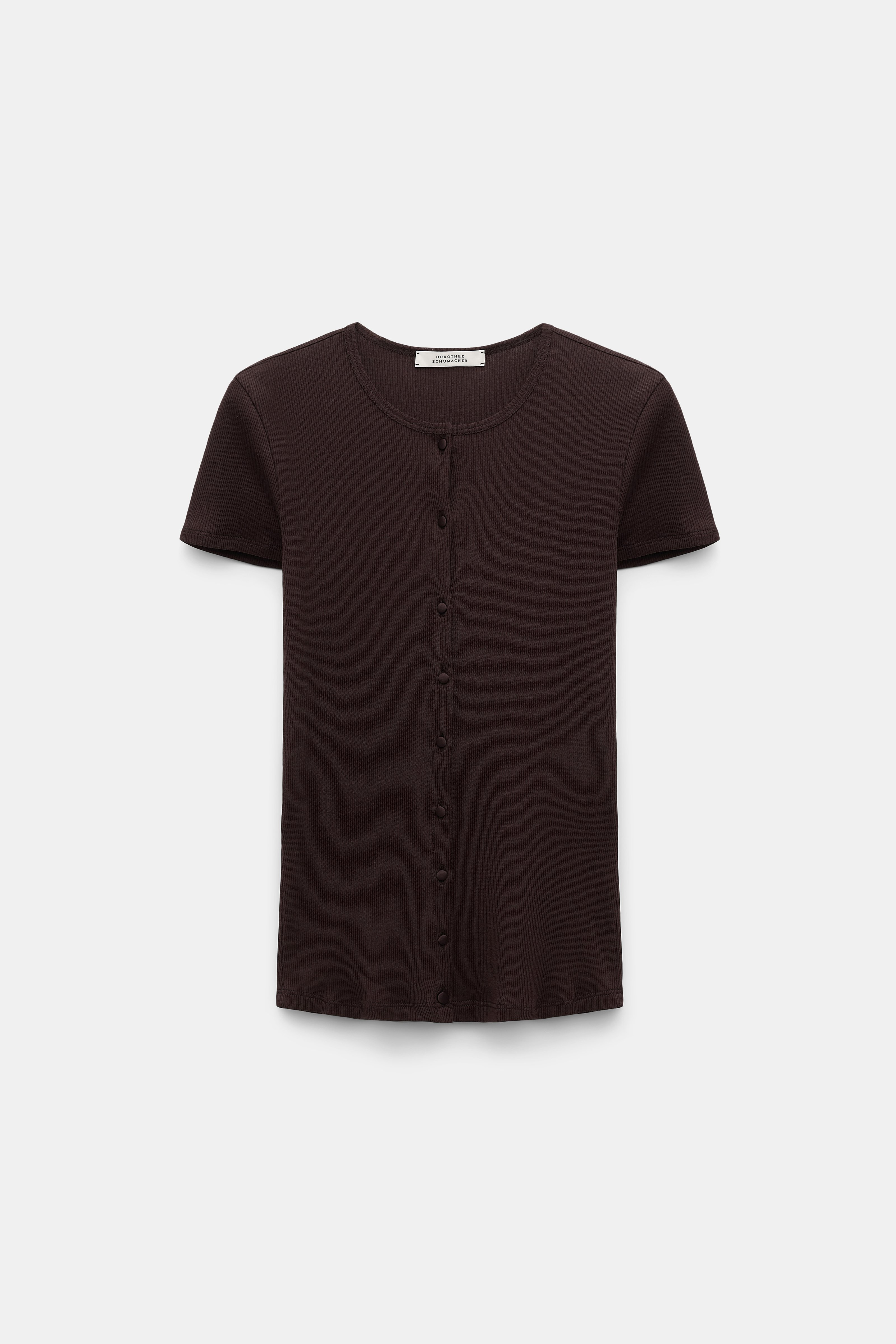 The short sleeve top is made from luxurious, rib knit cotton. The form-fitting style has a round neckline and cardigan-style button closures. Material & Care - 100 % Cotton - Button-down top in luxurious rib knit - Button placket with satin buttons (closed from the chest to hem) - Double-needle stitched cuffs and hem - Hand wash cold / Machine wash old - Wash with similar colors Size & Fit - Our model is 179cm tall and wears a size 2 - Fitted shoulders - Form-fitting