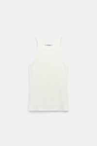 The tank top is made from luxurious, rib knit cotton. The form-fitting style has a round neckline and cut-in shoulders. Material & Care - 100 % Cotton - Tank top in luxurious rib knit - Binding on the neckline and sleeve opening - Double-needle stitched hem - WE CARE - This item is finished according to OEKO-TEX® STANDARD 100, 22.0.98928 Hohenstein - Hand wash cold / Machine wash old - Wash with similar colors Size & Fit - Our model is 180cm tall and wears a size 2 - Form-fitting