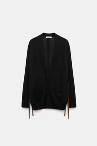 It's all about the details: The knit cardigan is made from a soft wool-cotton blend and has a V-neckline. The loose fitting style has patch pockets and faux suede ties on the sides. Material & Care - 49 % Wool, 46 % Cotton, 4 % Polyamide, 1 % Elastane - Wool-cotton blend V-neck cardigan - Faux suede side ties - Patch pockets - Hidden button placket - Rolled cuffs - WE CARE - This item is finished according to STANDARD 100 by OEKO-TEX, 22.0.98928 Hohenstein HTTI - Hand wash cold / Machine wash cold - Wash with similar colors - Remove all detachable parts before cleaning - Contains non-textile parts of animal origin Size & Fit - Our model is 178cm tall and wears a size S - Loose fit - Falls to the hip - Dropped shoulders - Loose sleeves, fitted cuffs