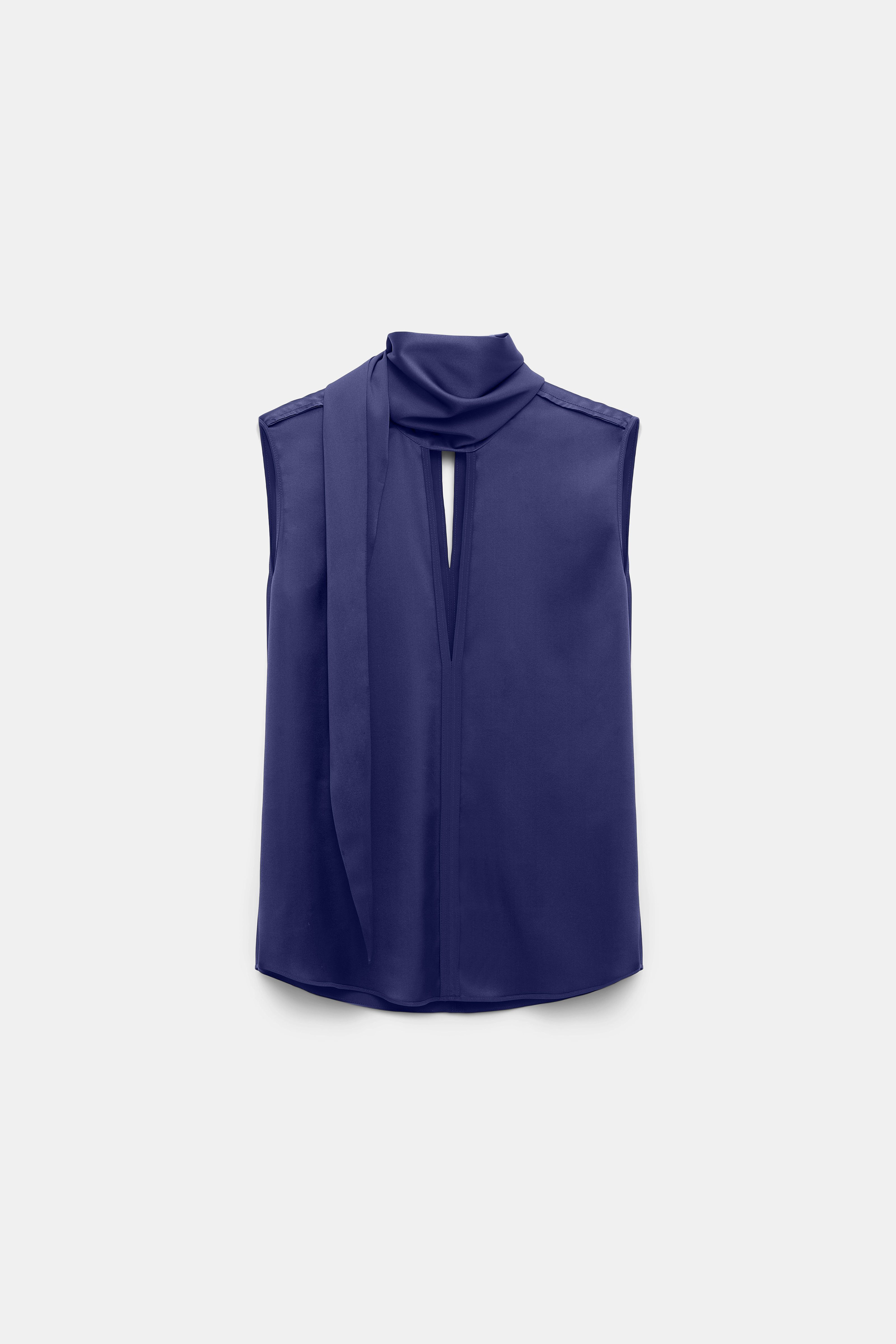 The sleeveless blouse is styled in silk satin and has a scarf collar. The blouse can be worn as a set with the matching bias-cut skirt. Material & Care - 100 % Silk - Sleeveless blouse in silk satin - V-neckline with scarf detail - Matte and glossy material play - Hand wash cold / Machine wash - Wash with similar colors - Contains non-textile parts of animal origin Size & Fit - V-neckline with scarf detail - Relaxed fit