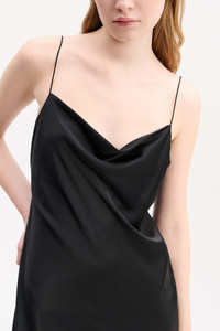 A pretty first layer or stand-alone piece in stretchy satin, the bias cut dress is made super feminine with a draped neckline and thin spaghetti straps. Material & Care - 95 % Silk, 5 % Elastane - Loosely fitted stretch silk-satin dress - Draped waterfall neckline - Spaghetti straps - Cut on the bias for a pretty drape - Midi length - Hand wash programm cold / Machinewash - Wash with similar colours Size & Fit - Our model is 177cm tall and wears a size S - Loosely fitted - Straight silhouette
