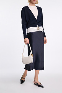 Cut on the bias for a fitted drape, the silk charmeuse skirt is both simple and striking. The soft shine style pulls on and has an elastic waist. For a dress-like look, mix and match with the boxy blouse. Material & Care - 100 % Silk - Silk charmeuse skirt - Bias cut - Elastic waist - Hand wash cold / Machine wash cold - Wash with similar colors - Shield from sharp items Size & Fit - Our model is 180cm tall and wears a size 2 - Fitted