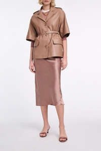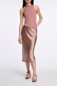 Cut on the bias for a fitted drape, the silk charmeuse skirt is both simple and striking. The soft shine style pulls on and has an elastic waist. For a dress-like look, mix and match with the boxy blouse. Material & Care - 100 % Silk - Silk charmeuse skirt - Bias cut - Elastic waist - Hand wash cold / Machine wash cold - Wash with similar colors - Shield from sharp items Size & Fit - Our model is 180cm tall and wears a size 2 - Fitted