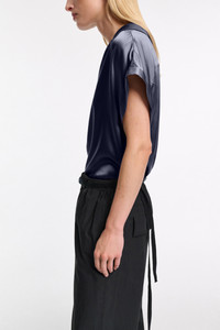 Styled with an open collar and popover silhoeutte, the silk charmeuse blouse is both simple and striking. The soft shine style has short cap sleeves with stitched cuffs and a boxy drape. For a dress-like look, mix ad match with the bias cut skirt. Material & Care - 100 % Silk - Silk charmeuse boxy blouse - Open neckline with petite notched collar - Decorative seams angle to the outside with babylock trim - Slightly turned-up front hem - Back yoke - Hand wash cold / Machine wash cold - Wash with similar colors - Shield from sharp items Size & Fit - Our model is 178cm tall and wears a size 2 - Boxy fit - Slight dropped shoulders