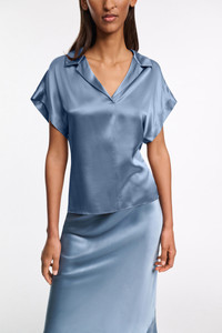 Styled with an open collar and popover silhoeutte, the silk charmeuse blouse is both simple and striking. The soft shine style has short cap sleeves with stitched cuffs and a boxy drape. For a dress-like look, mix ad match with the bias cut skirt. Material & Care - 100 % Silk - Silk charmeuse boxy blouse - Open neckline with petite notched collar - Decorative seams angle to the outside with babylock trim - Slightly turned-up front hem - Back yoke - Hand wash cold / Machine wash cold - Wash with similar colors - Shield from sharp items Size & Fit - Our model is 178cm tall and wears a size 2 - Boxy fit - Slight dropped shoulders