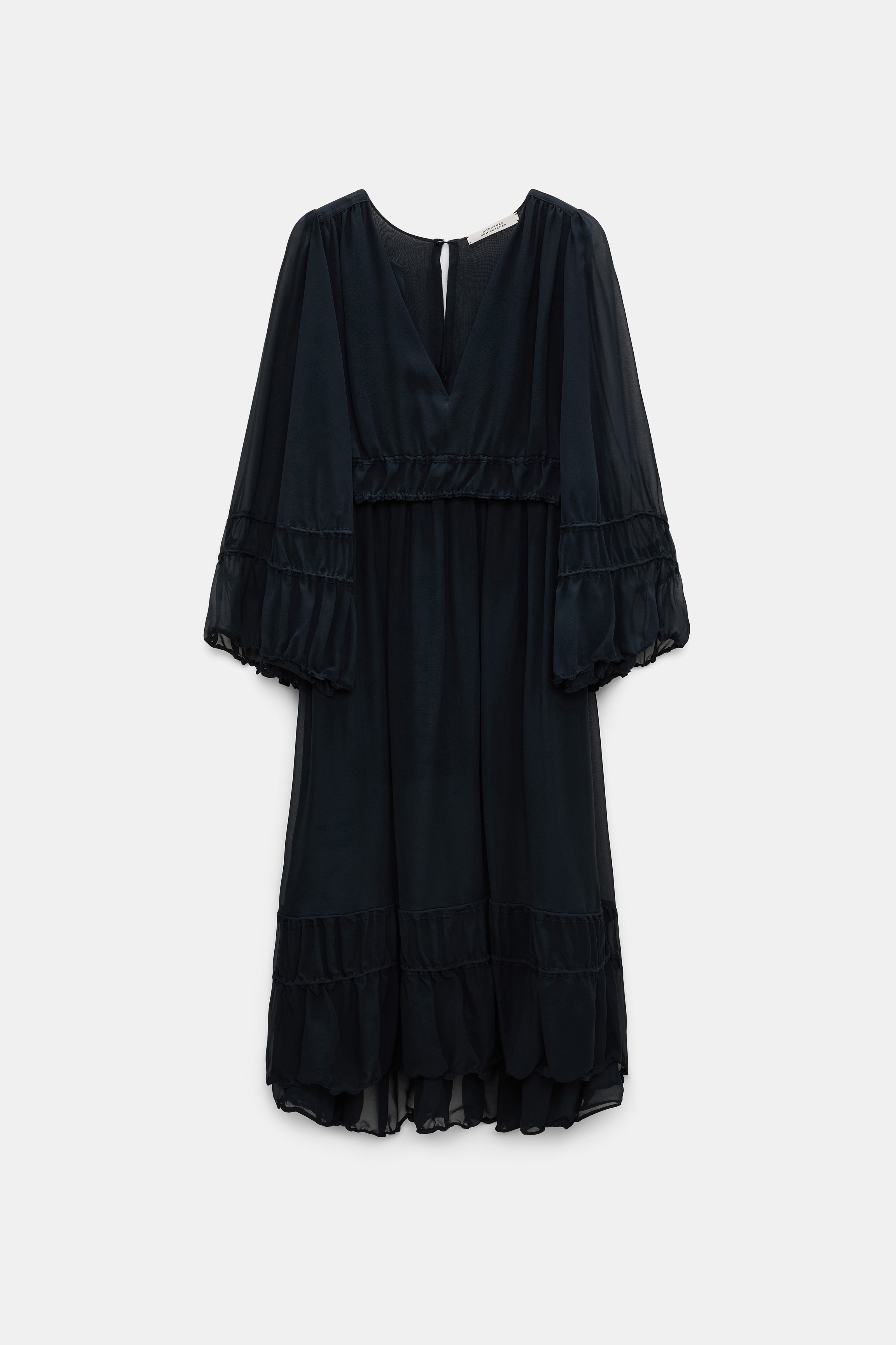 The silk-georgette dress is loosely fitted and has soft shirring. The dress has a deep V-neckline and wide long sleeves. The hemline drapes slightly longer in the back. Material & Care - 100 % Silk - Long sleeve dress in silk-georgette - V-neckline - Shirred detailing - Transparent caftan sleeves - Slightly longer hem in the back - Slit with button closure at the nape - Lined - Very mild fine wash wool-silk cycle / Cold wash / No hand wash - Wash with similar colors - Contains non-textile parts of animal origin Size & Fit - Our model is 180cm tall and wears a size 2 - Fitted shoulders - Wide sleeves - Loosely fitted silhouette