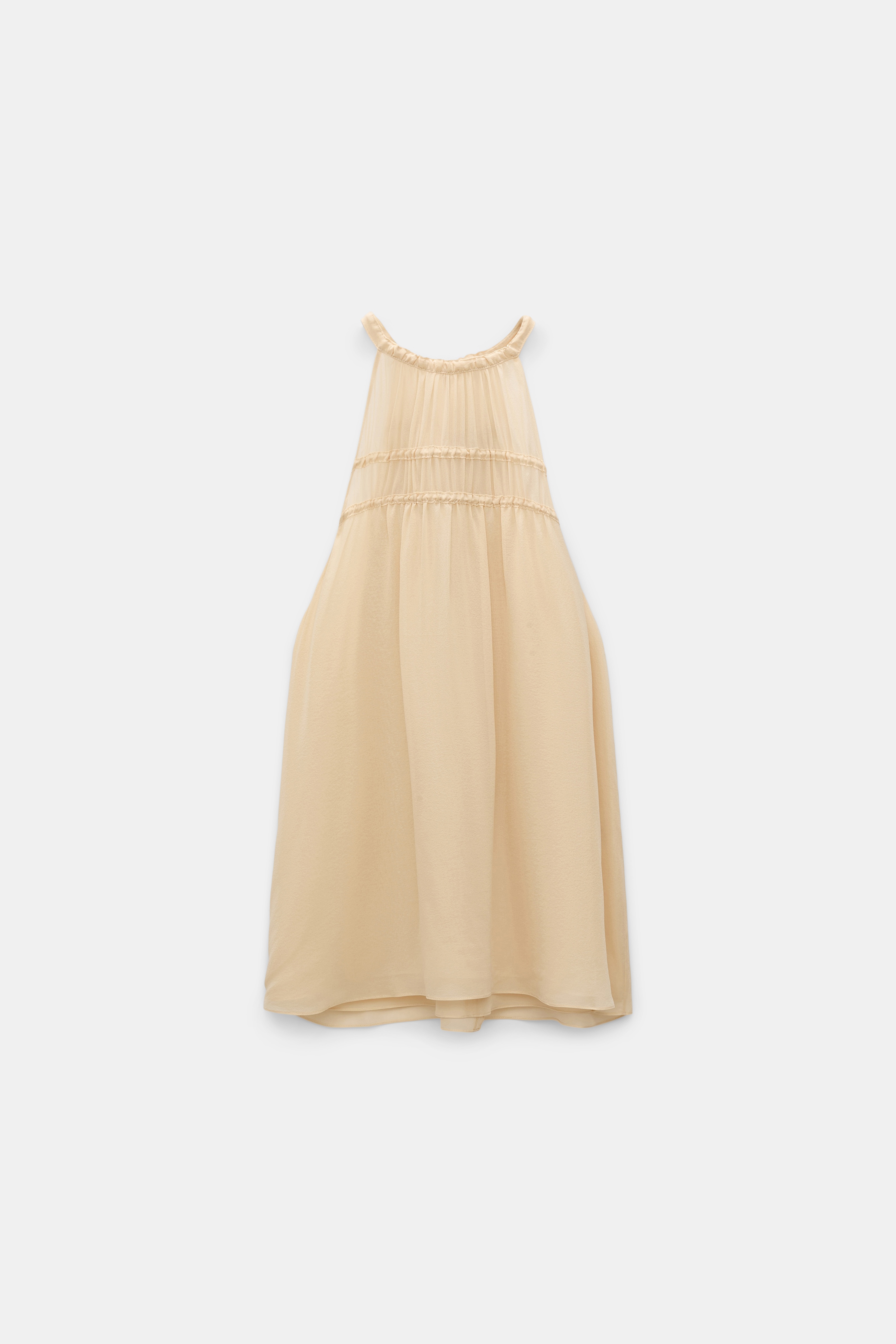 The silk-georgette tank top is loosely fitted and has soft shirring. The top has a high halter neckline with draped bands at the back. The hemline drapes slightly longer in the back. Material & Care - 100 % Silk - Silk-georgette tank top - Shirred detailing - Contrasting sheer and double layer transparency - High halter neckline with draped bands at the back - WE CARE - This item is finished according to STANDARD 100 by OEKO-TEX, 22.0.98928 Hohenstein HTTI - Hand wash program / Machine wash - Wash with similar colors Size & Fit - Our model is 178cm tall and wears a size 2 - Sleeveless - Halter neckline - Loosely fitted silhouette