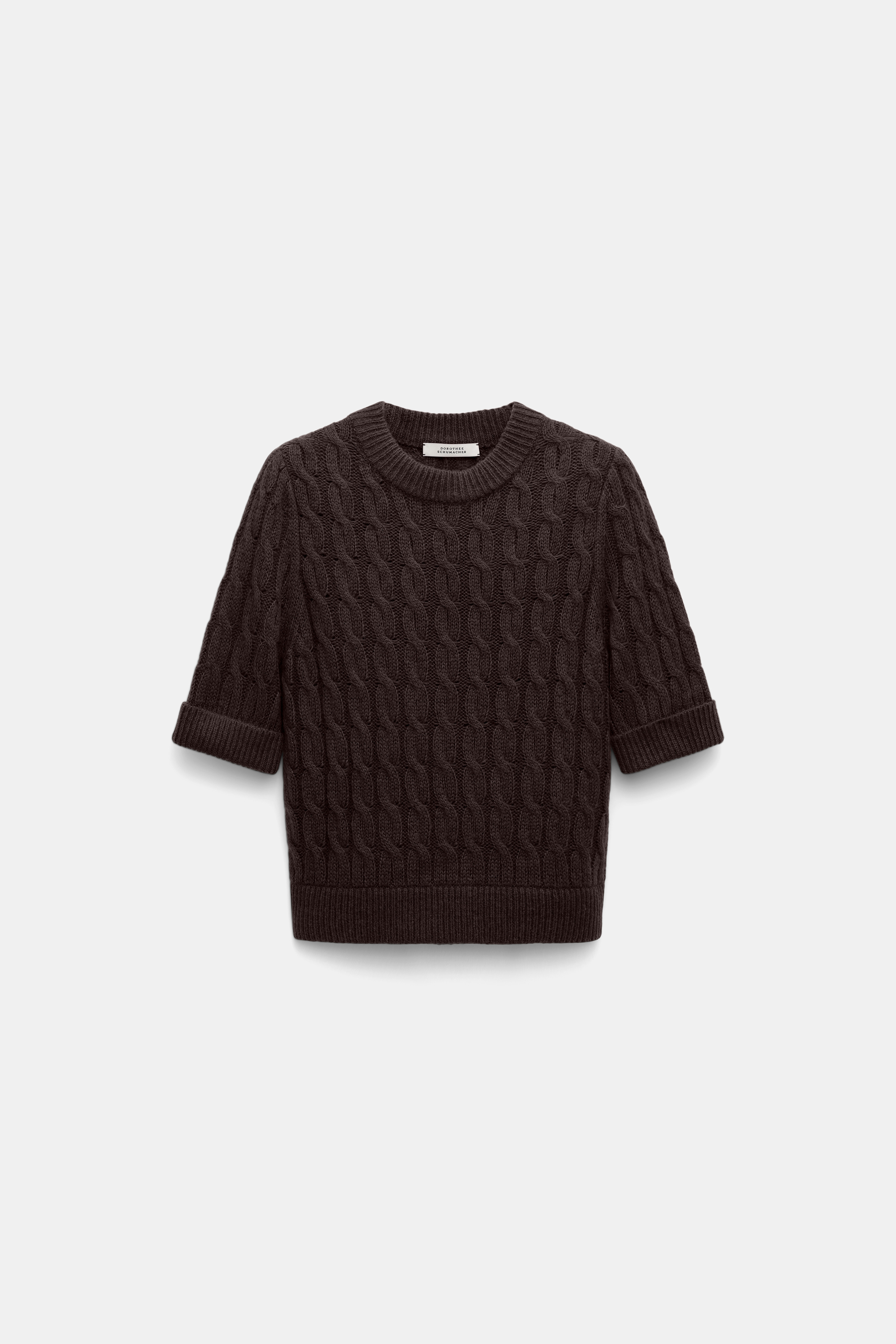 Knit with alpaca, the cable knit pullover has an extra soft finish. The top has short sleeves and ribbed knit trim. Material & Care - 35 % Polyamide, 30 % Lyocell, 20 % Wool, 15 % Alpaca - Cable knit short sleeve pullover with alpaca - Round neckline - WE CARE - This item is finished according to OEKO-TEX® STANDARD 100, 22.0.98928 Hohenstein - Hand wash cold / Machine wash old - Wash with similar colors Size & Fit - Our model is 179cm tall and wears a size 2 - Loosely fitted